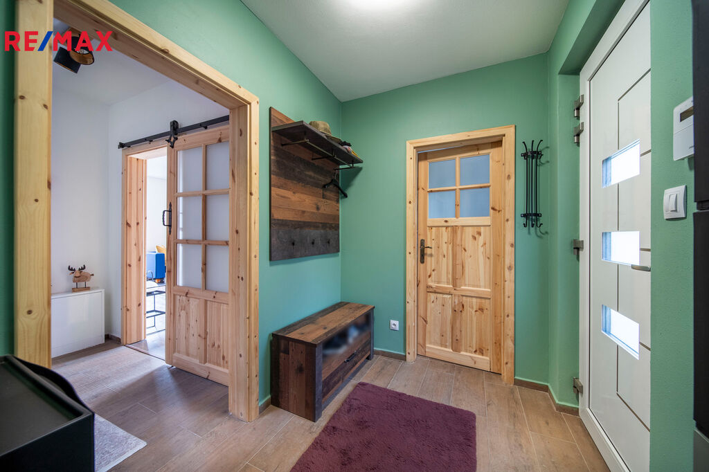 * **Dispozice 4+kk** – vzdušný obývací prostor s krbem a kuchyňským koutem, tři útulné ložnice v patře, dvě koupelny