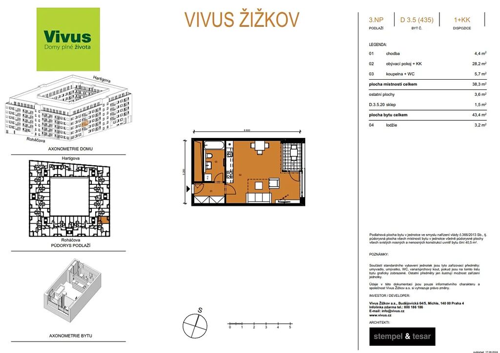 Byt je orientován do klidné ulice spojující ulice Roháčova a Hartigova a nachází se v 3.NP. Jeho součástí je sklep, navíc nabídne vysoký standard včetně podlahového topení či exteriérových žaluzií.