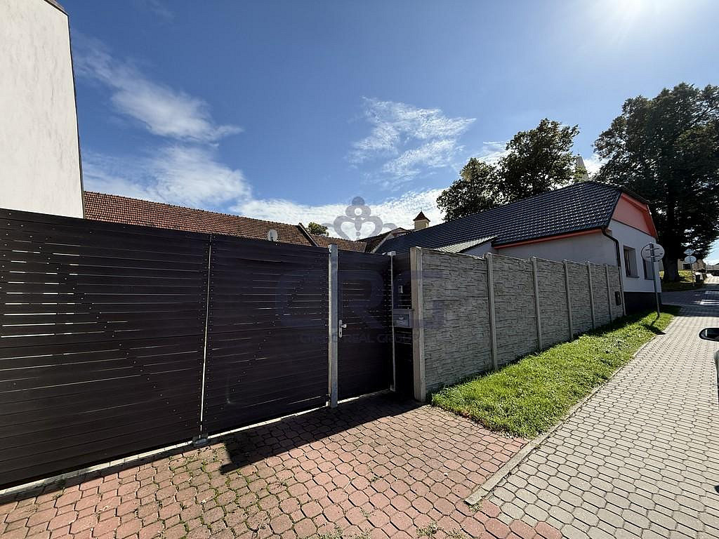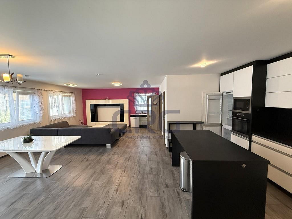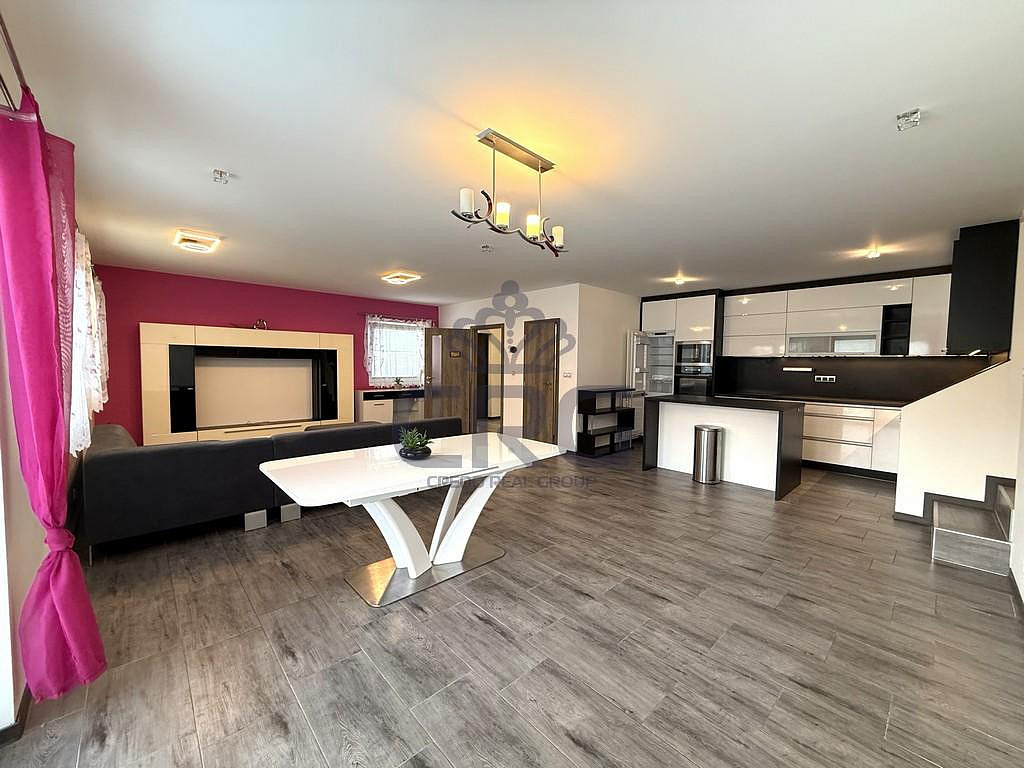 Při vstupu do nemovitosti se ocitneme v prostorné předsíni o velikosti cca 7,5 m². V místnosti je dostatek prostoru pro skříň či věšák pro odkládání. Dále pokračujeme do velkého obývacího pokoje, který je spojen s kuchyňským koutem. Velikost této místnosti je cca 50 m². Kuchyňská linka je vybavena sklokeramickou deskou, myčkou, troubou lednicí s mrazákem a digestoří. Součástí této místnosti je i komora či sklad s regály o velikosti cca 2,7 m². Z této části vejdeme po dvou schodech do příjemné světlé chodby o výměře cca 9,31 m², ve které je vestavná skříň se spoustou úložného prostoru a nachází se v ní i kotel, který zajišťuje vytápění domu samotného. Z chodby je vstup do ostatních samostatných místností v domě. Je zde nádherná velká koupelna o velikosti cca 6,6 m², ve které je k dispozici vana, toaleta a umyvadla. WC je samostatné a jeho výměra je cca 1,5 m². V domě jsou dva pokoje, z toho místnost, která původně sloužila jako dětský pokoj je o velikosti cca 15,1 m². Druhá místnost, která původně sloužila jako ložnice, má vlastní šatnu s vestavnými skříněmi a její celková plocha činí cca 18,7 m².