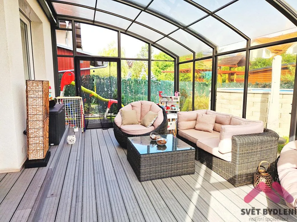 Zimní zahrada s posuvným otevíráním - skvělé místo pro odpočinek, rodinné oslavy nebo posezení s přáteli po celý rok. Velký zahradní domek pro uskladnění nářadí či sportovního vybavení. Zděný nadzemní bazén pro letní osvěžení. Možnost ponechání herních prvků pro děti (houpačky, skluzavky apod.). Parkování pro dvě auta - jedno stání na pozemku a jedno přímo před domem.