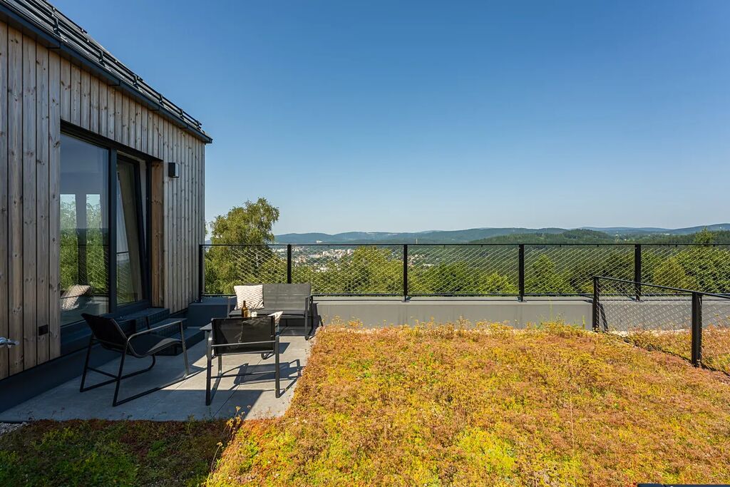 Nabízíme k prodeji exluzivní byt s bezkonkurenčními výhledy. Jedná se o byt B33 o dispozici 3+kk a celkové výměře 89,1 m² dle NOZ (čistá užitná plocha 85,9 m²). Byt se nachází ve 4. podlaží a je orientován na všechny světové strany. Jedná se o unikátní byt/dům postavený na střeše bytového domu. K bytu náleží dvě terasy, předzahrádka a samozřejmě sklepní kóje přímo na patře o velikosti 2,8 m². Cena zahrnuje i parkovací stání – vše je uvedeno včetně DPH.