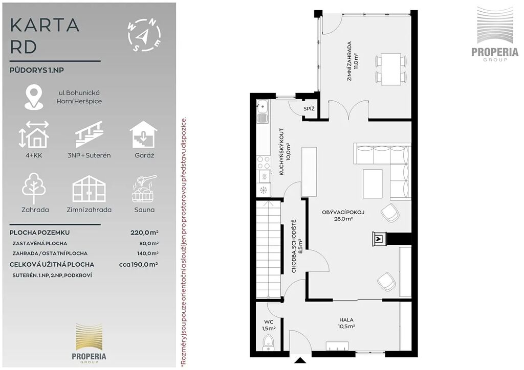 Dům má dvě plnohodnotná obytná podlaží, podkroví s možností dalšího rozšíření a suterén, kde se nachází garáž, sauna a technické zázemí.