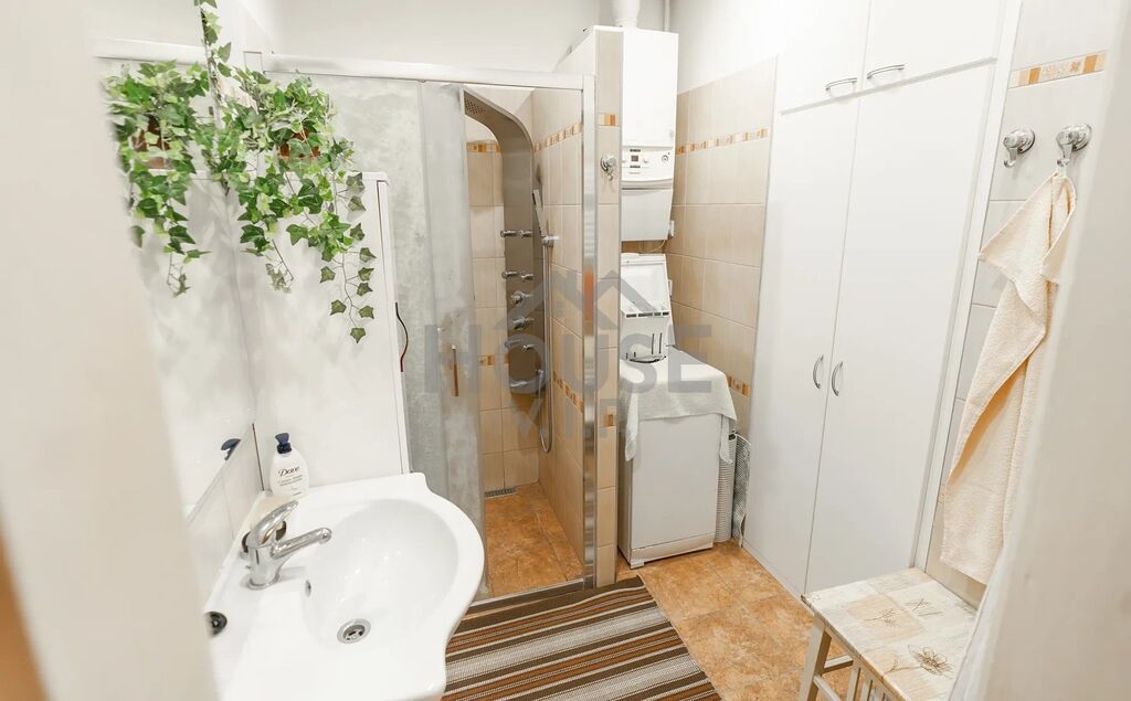 • Koupelna s masážní sprchou (4 m²), samostatné WC (1,3 m²), spíž (1,3 m²) a komora (1,9 m²)
