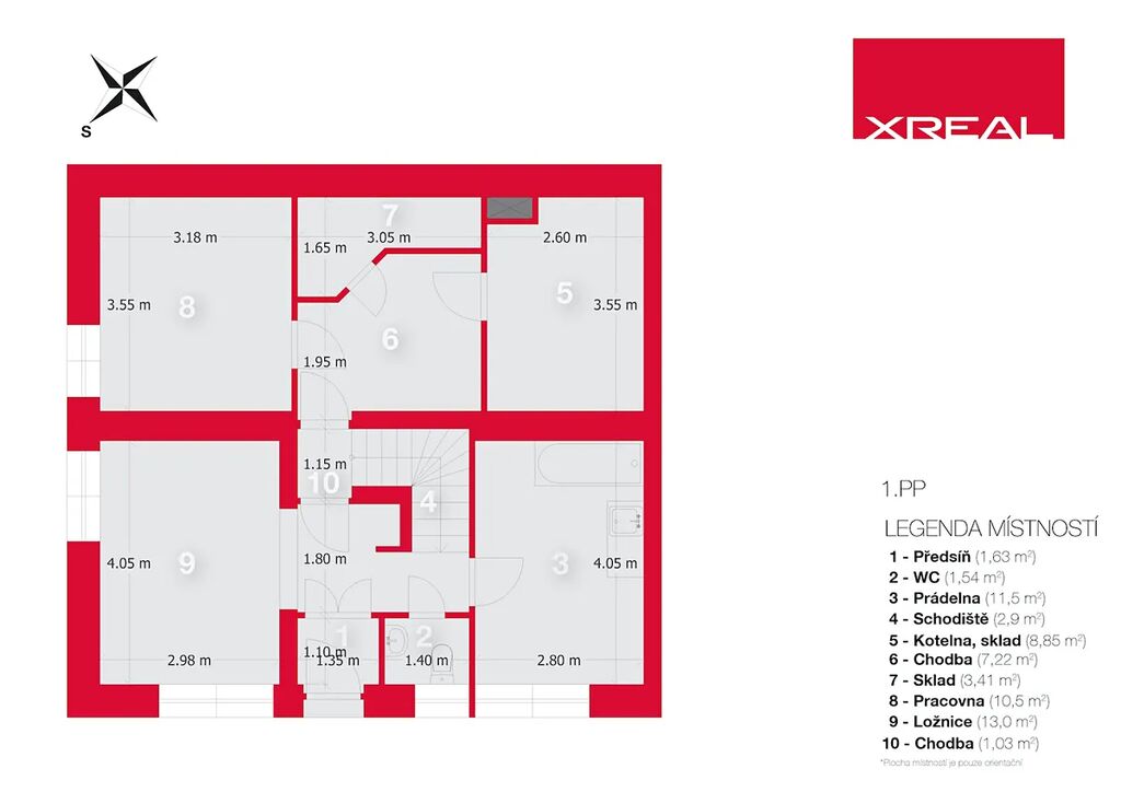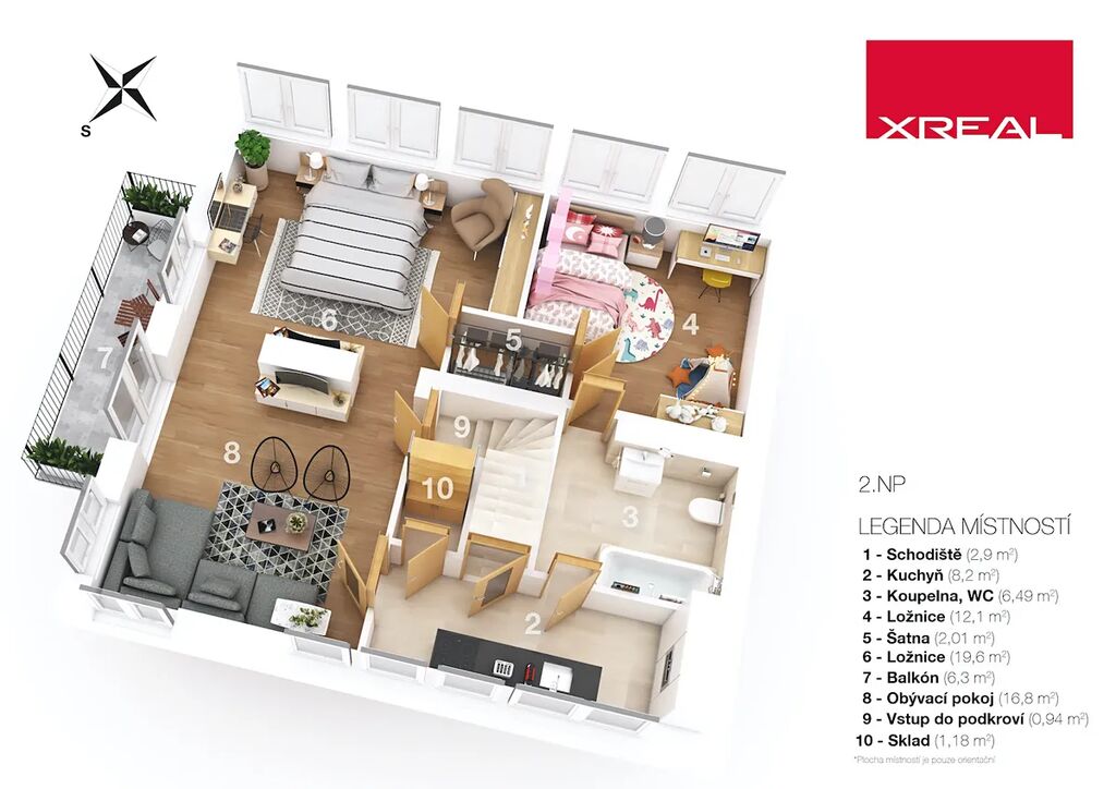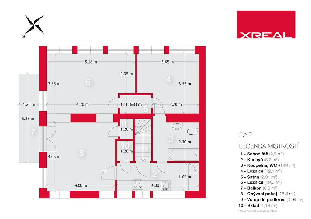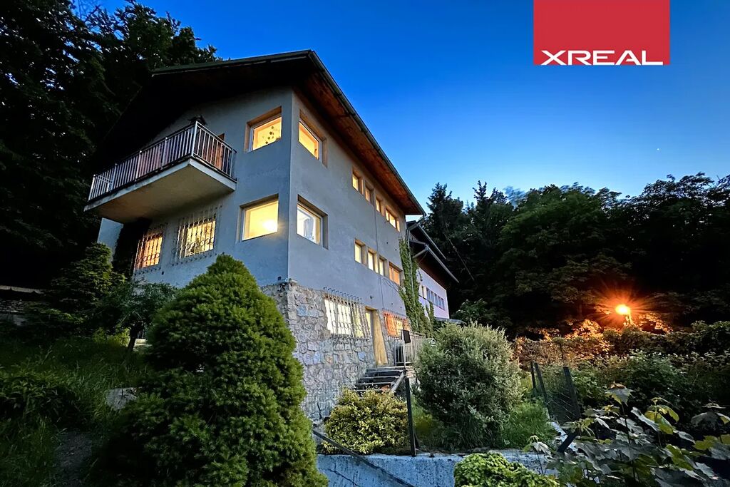 10 místností, 3 koupelny, 2 garáže, balkon, terasa.