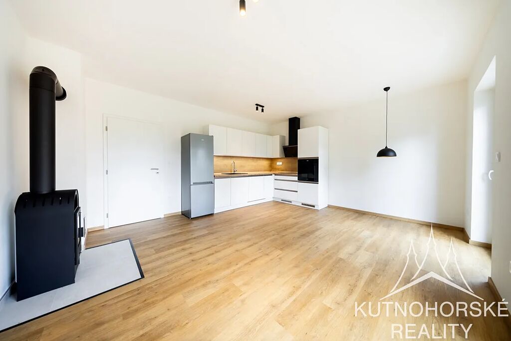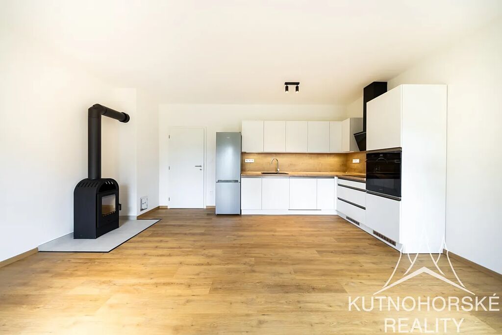 krbová kamna v obývacím pokoji s kuchyní