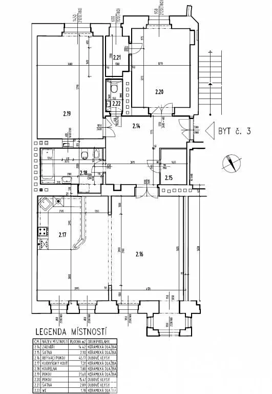 Dispozice bytu: zádveří/hala 14,5m2, šatna 3m2, obývací pokoj se zimní zahradou 45m2 + kuchyňský kout 7m2, koupelna 8m2, pokoj 21,5m2 a další pokoj 15,5m2 + druhá šatna 3 m2, WC 1,5m2.