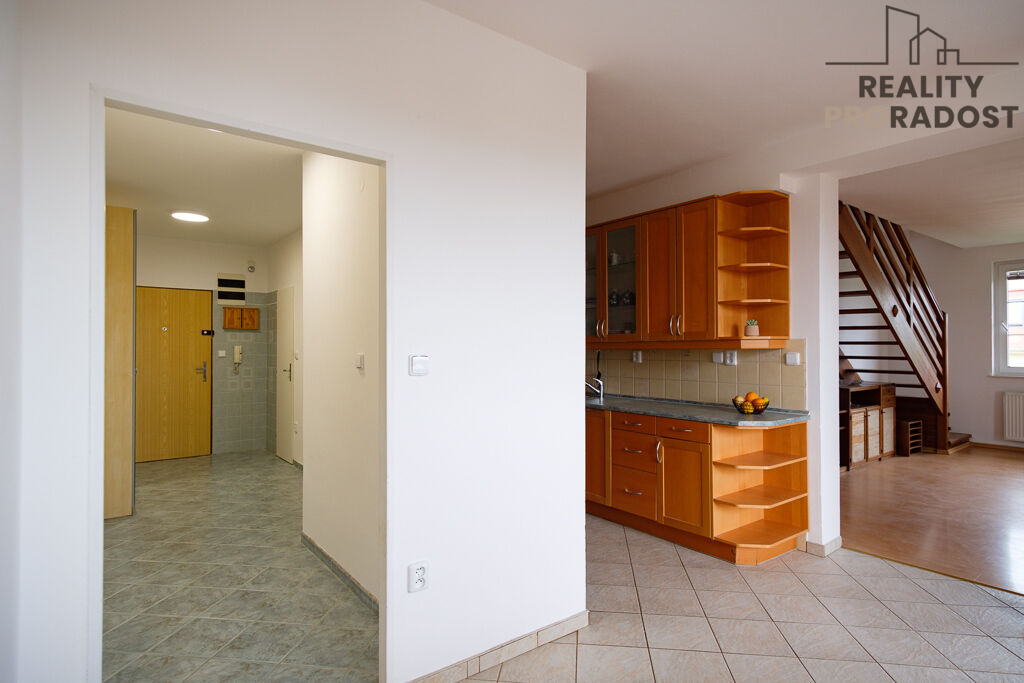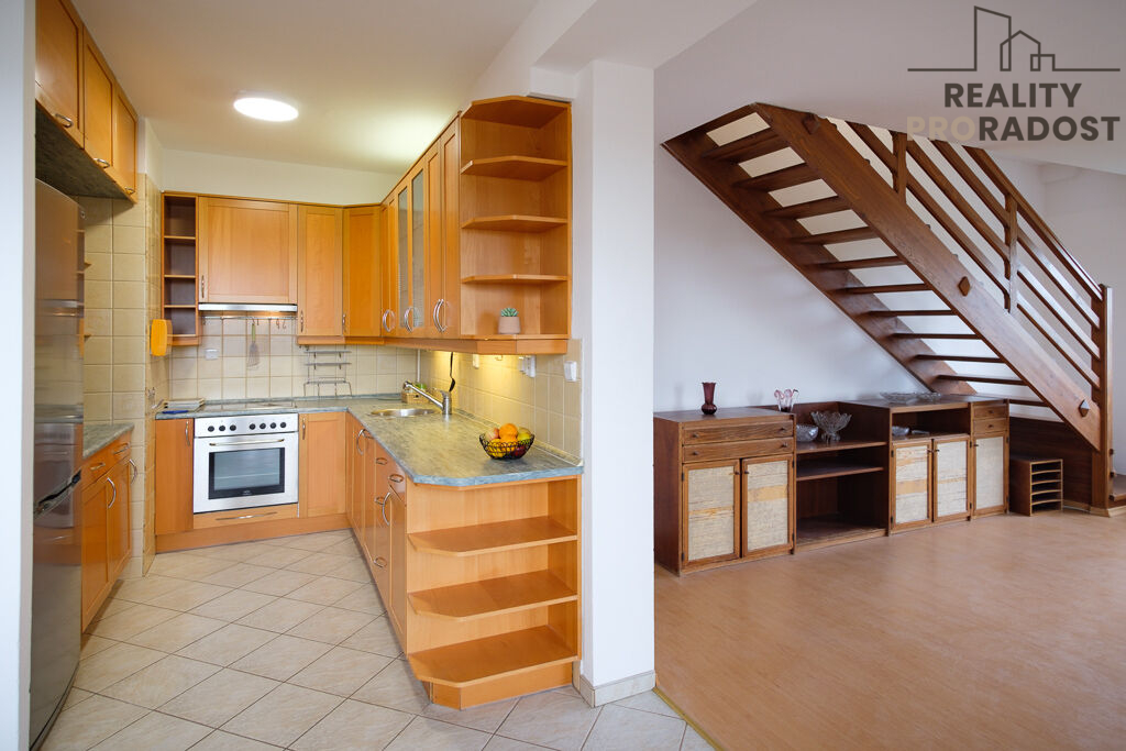 Byt je velice dobře dispozičně řešen – z prostorné vstupní chodby je vlevo vstup do koupelny se sprchovým koutem, umývadlem a pračkou, dále vstup na samostatné WC a přímo proti vchodu se vchází do hlavní obytné části bytu – kuchyně s jídelnou propojenou s obývacím pokojem. Z jídelny je vstup na lodžii a do ložnice, z obývacího pokoje je po dřevěném schodišti přístup do druhého podlaží mezonetového bytu. Zde jsou z chodby přístupné 3 neprůchozí pokoje a koupelna s vanou, dvěma umývadly a s WC (vše viz orientační plánek).