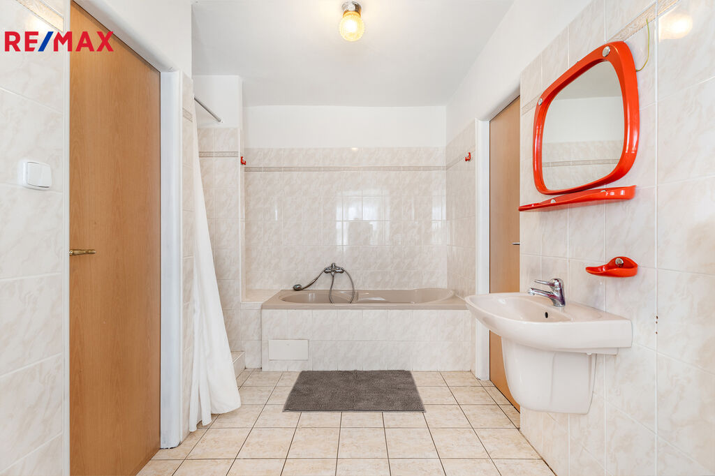 V patře je byt s velkým obývacím pokojem, ložnicí, pokojem, kuchyní s jídelním koutem, koupelnou a toaletou. V pravé části je velká společenská místnost s přilehlou koupelnou s toaletou a vstupem na pavlač.