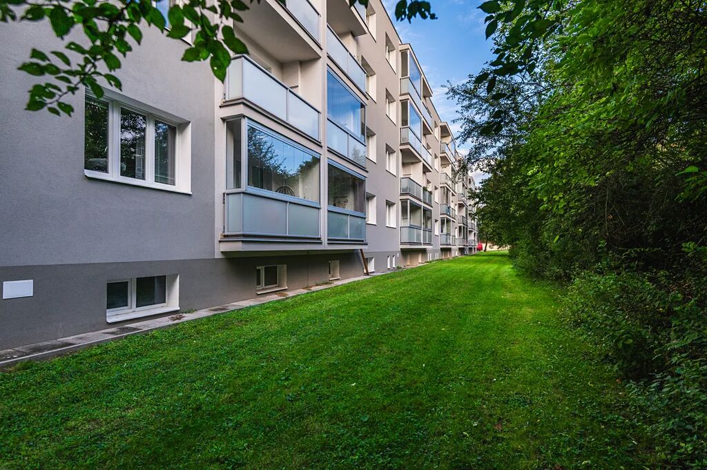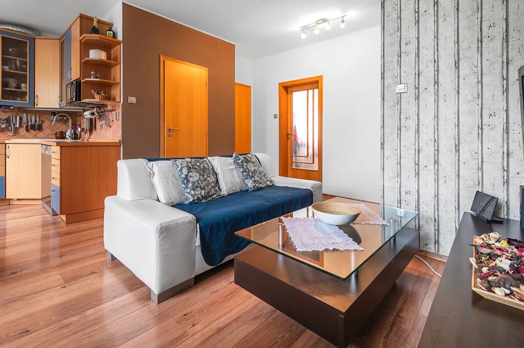 Dispozice bytu je prakticky řešena – centrálním bodem je prostorný obývací pokoj, ze kterého se pohodlně dostanete do všech dalších místností. K bytu náleží zasklená lodžie ideální pro relaxaci i balkón, který přináší dostatek denního světla.