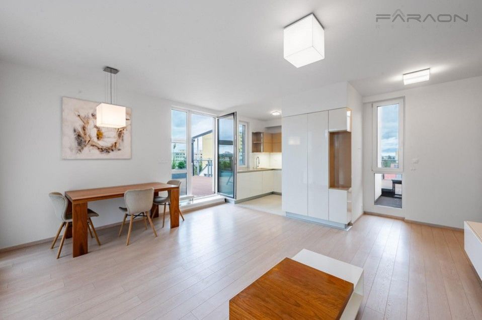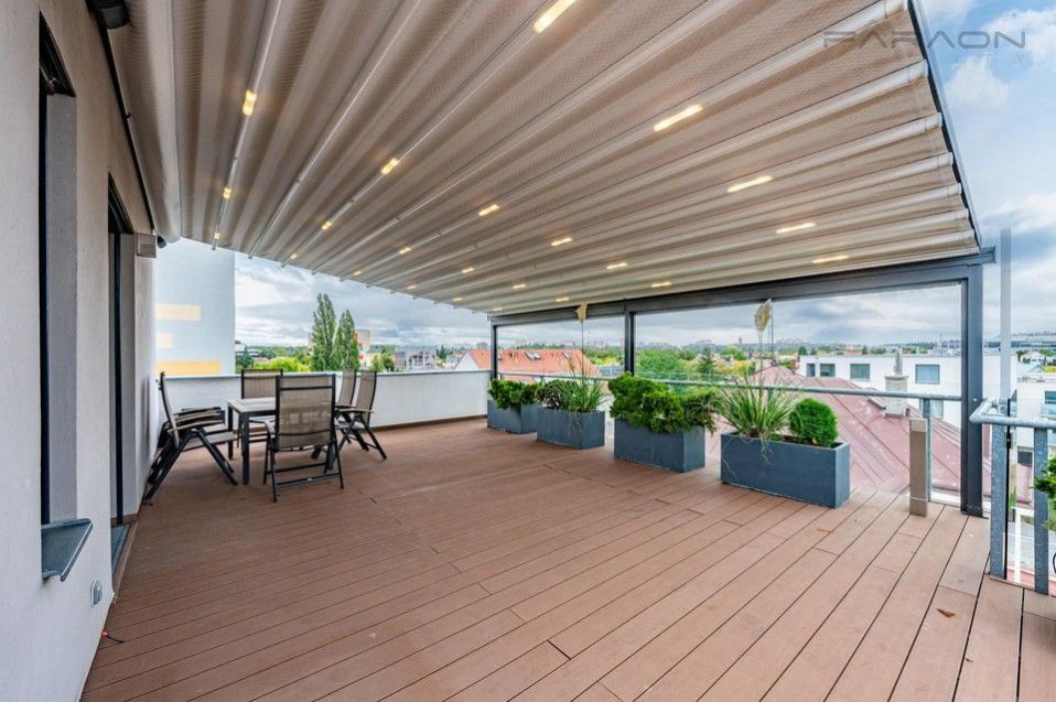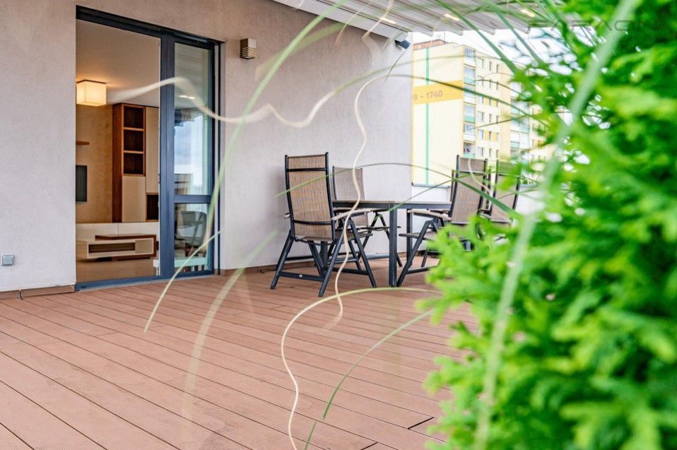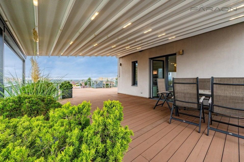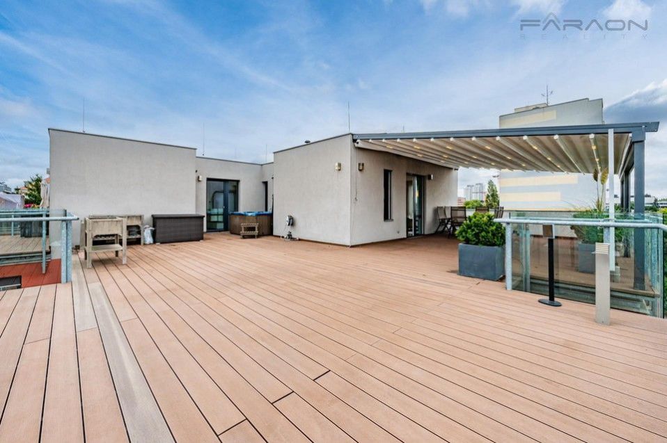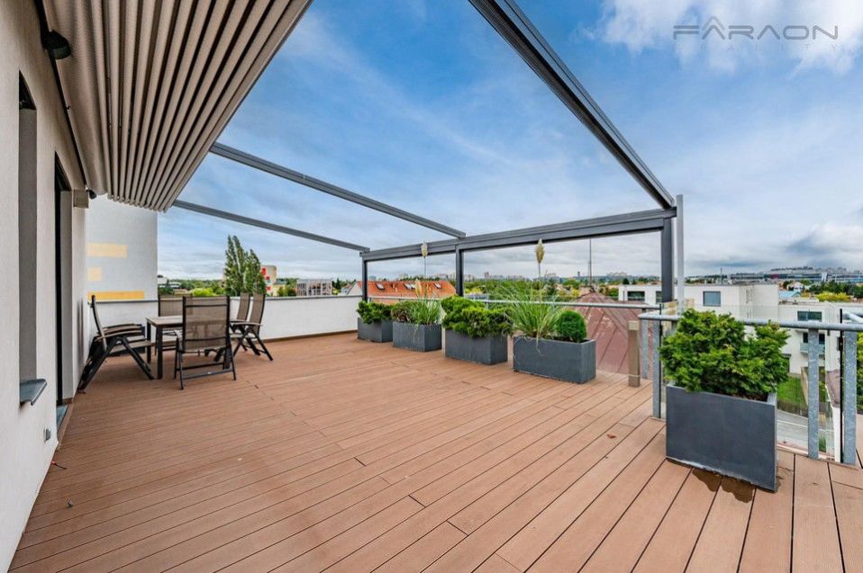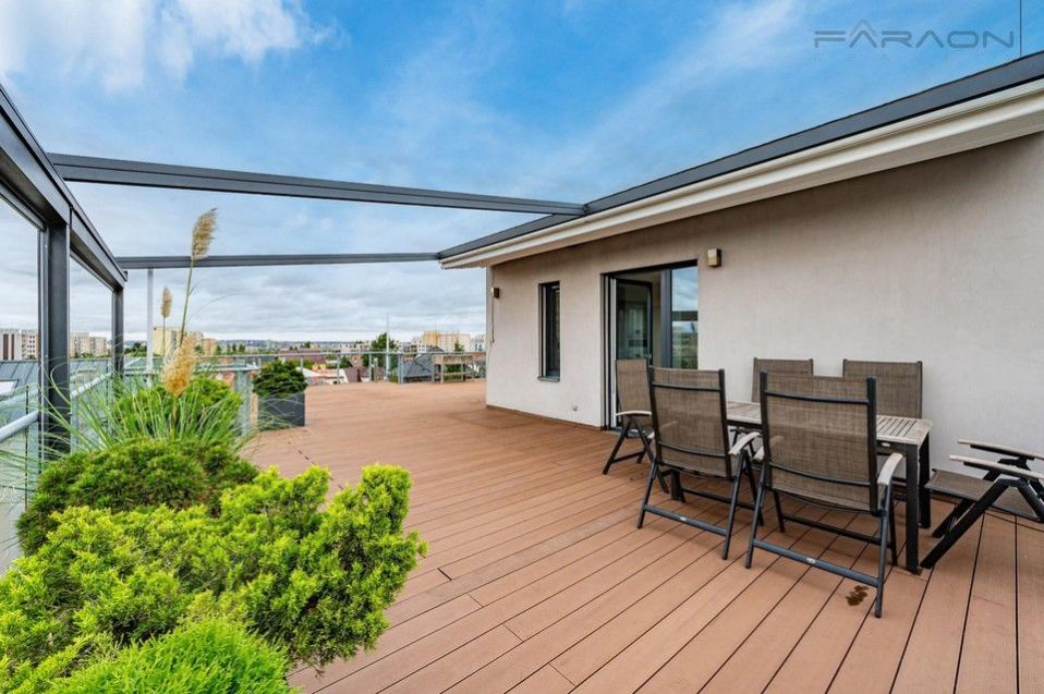 Pronájem krásného zařízeného bytu 3+kk (85 m2) s nadstandardně velkou střešní terasou (134 m2) umístěného v novostavbě menšího rezidenčního domu na Praze 4 - Chodov. Unikátní střešní byt zaručuje maximální soukromí a klidné rodinné bydlení. Součástí bytu jsou dvě parkovací stání v 1. podzemním podlaží, sklep.