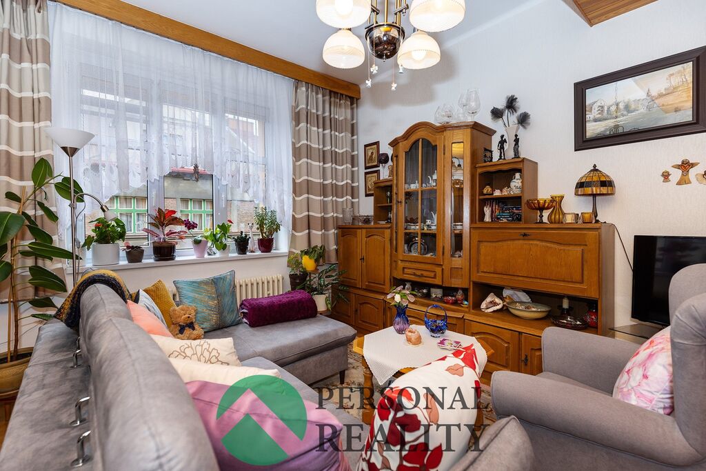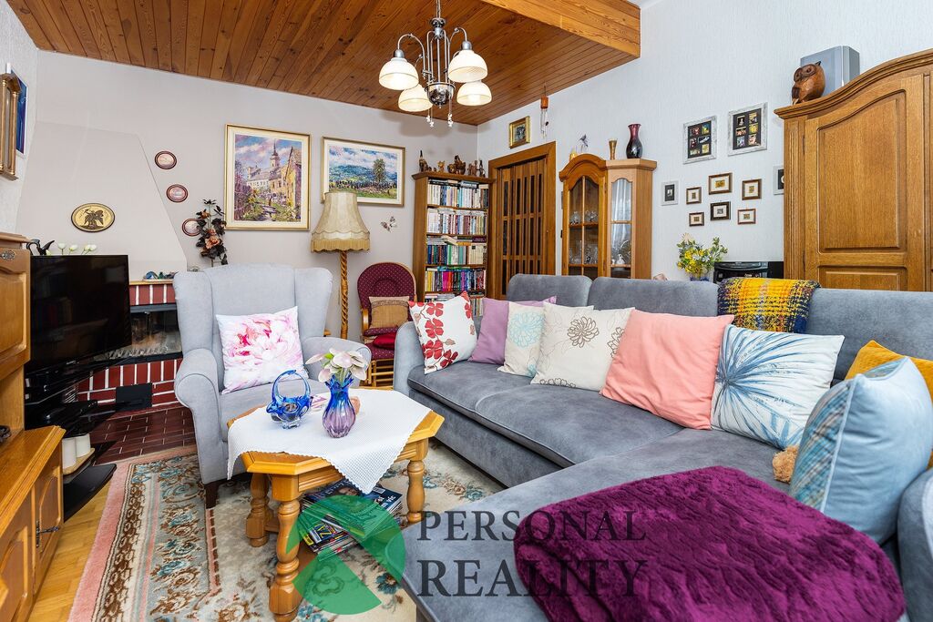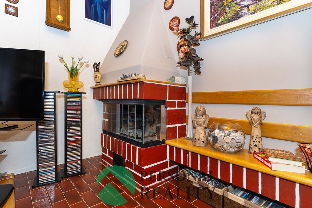 Dominantou bytu jsou vysoké stropy a zděný krb v obývacím pokoji, který interiéru dodává útulnou atmosféru.