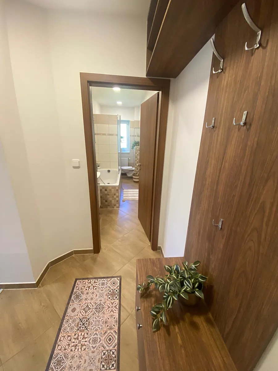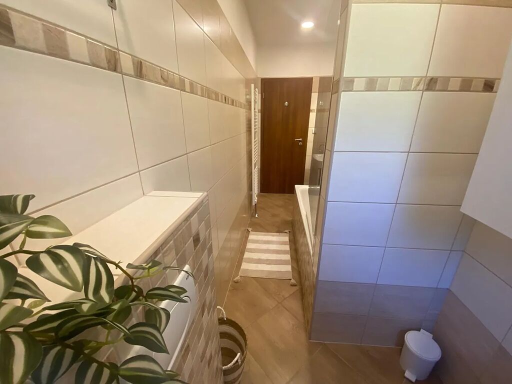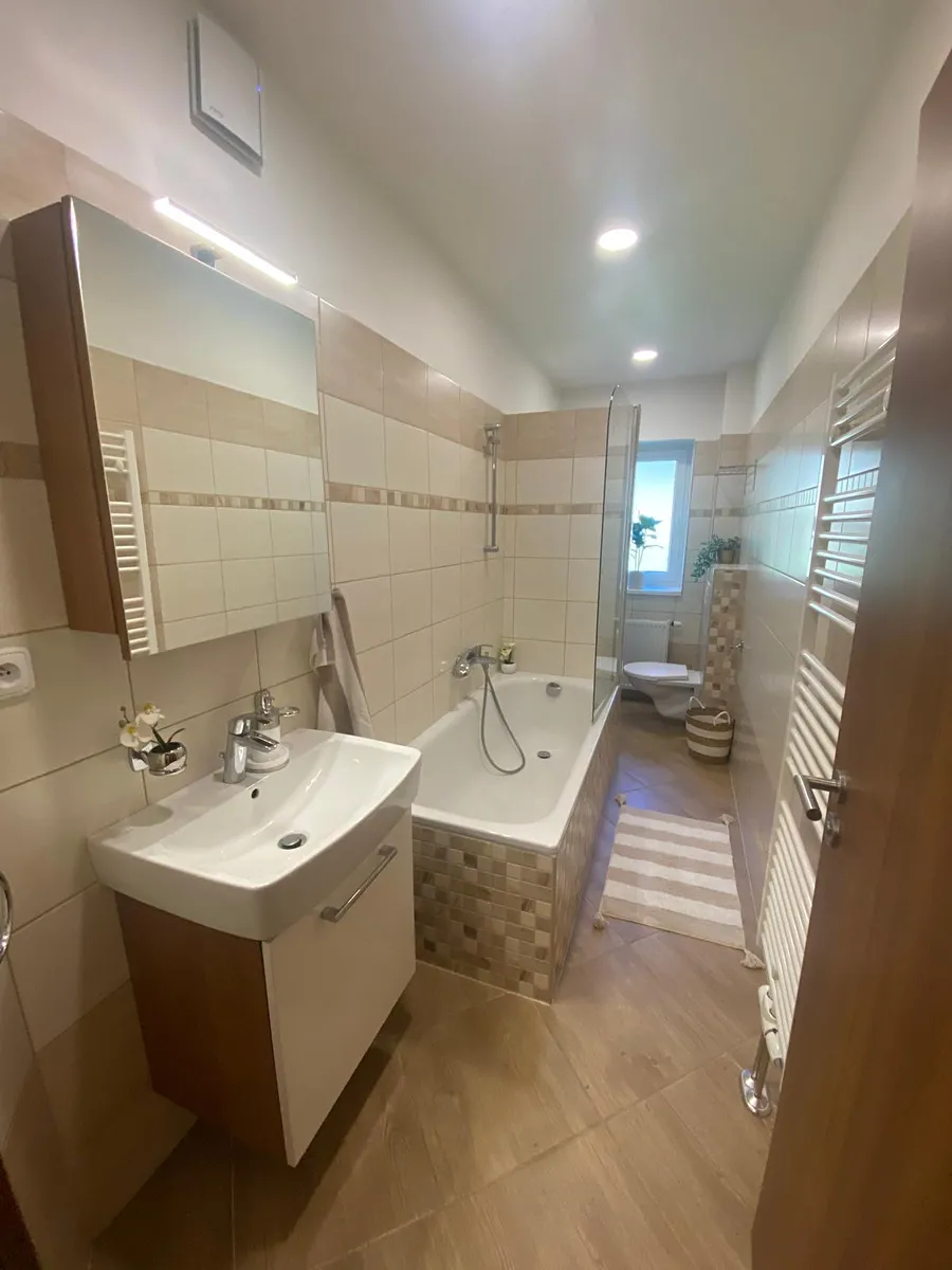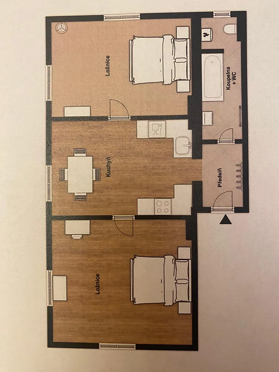 Dispozice bytu: předsíň s šatnou, naproti koupelna s oknem, vana se zástěnou, koupelnová skříňka s umyvadlem a zrcadlem, kotel + bojler, topný žebřík s napojením na rozvod topení, WC. Z předsíně vejdeme do prostorné kuchyně, v přední části se po obou stranách nachází kuchyňská linka, zadní zóna je jídelní a obývací. Z kuchyně jsou dva samostatné vstupy do pravé a do levé ložnice. Měsíční náklady 4 500 Kč (vytápění, voda, ohřev vody) a 450 Kč do FO.