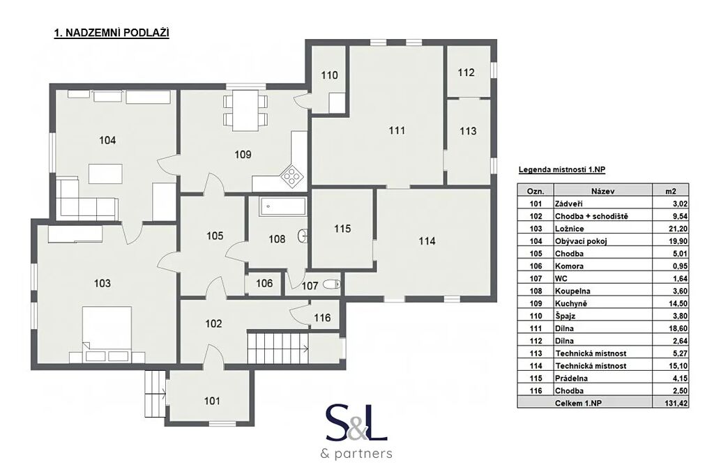 Podlahová plocha 302,70 m2 je rozdělaná mezi jednotlivá podlaží takto: