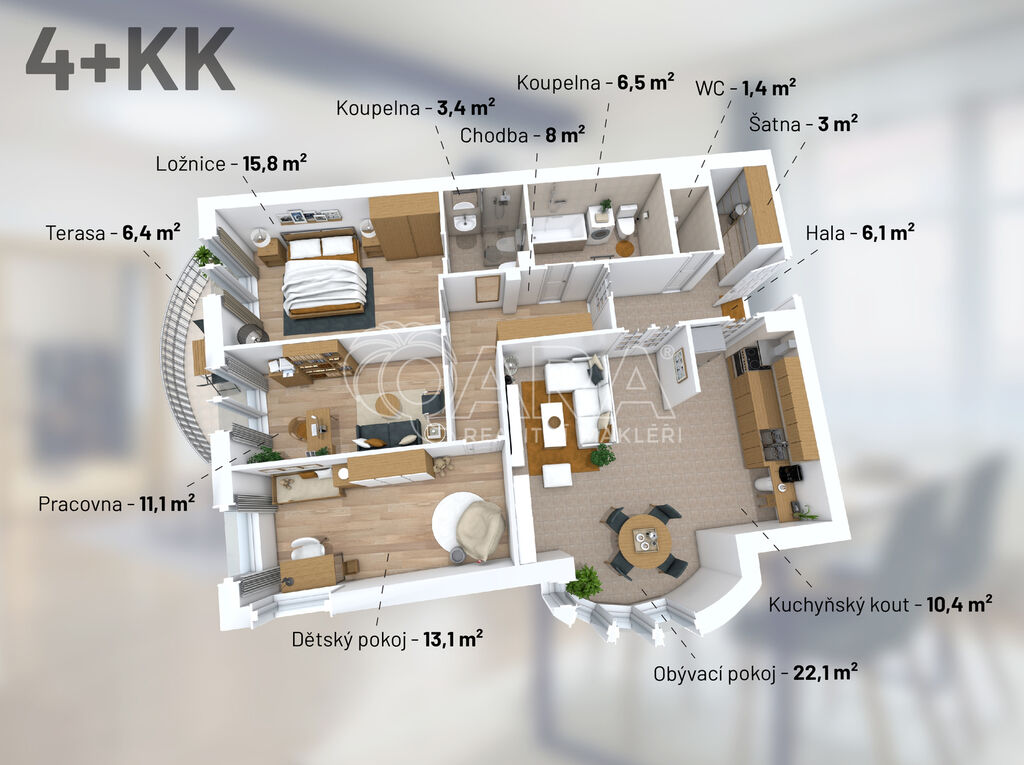 Komfortní byt 4+kk, 101 m2, s terasou 6 m2 a parkovacím stáním ve 3. NP oblíbeného rezidenčního projektu V Kapslovně. Obývací pokoj s kuchyňským koutem, 3 ložnice, 2 koupelny s vanou a sprchovým koutem, 3 x toaleta, šatna 3 m2, prostorná chodba, sklep 3 m2. Velmi dobře dispozičně řešený byt, vhodný k rekonstrukci dle Vašich představ, možno upravit na 4+1.