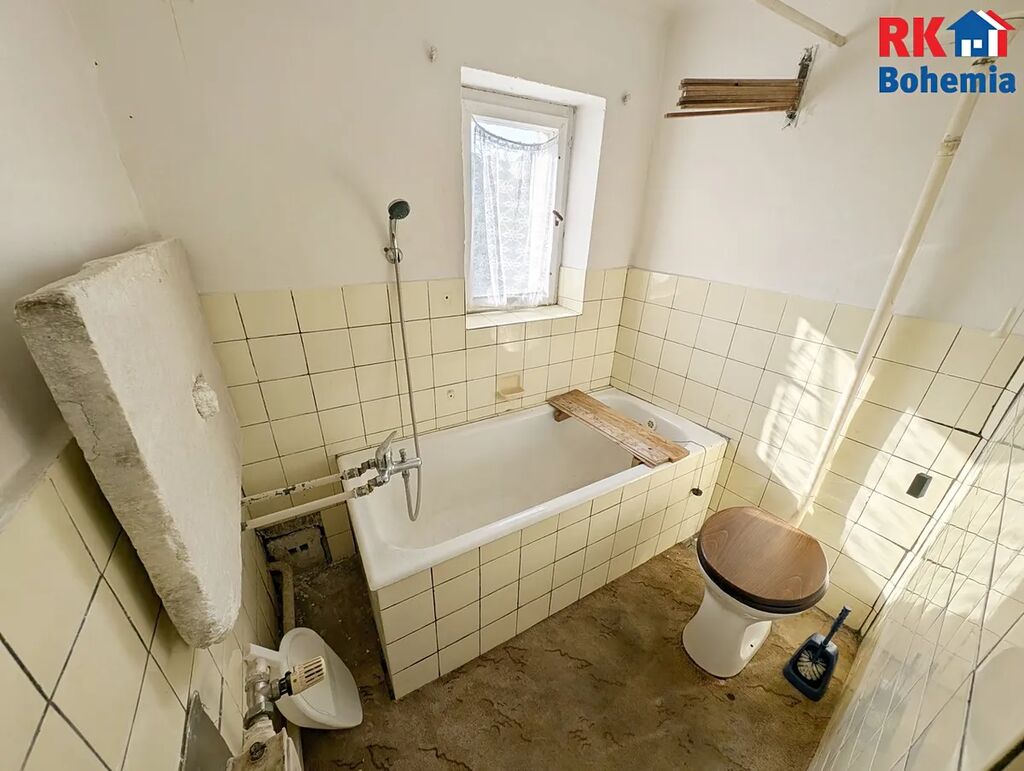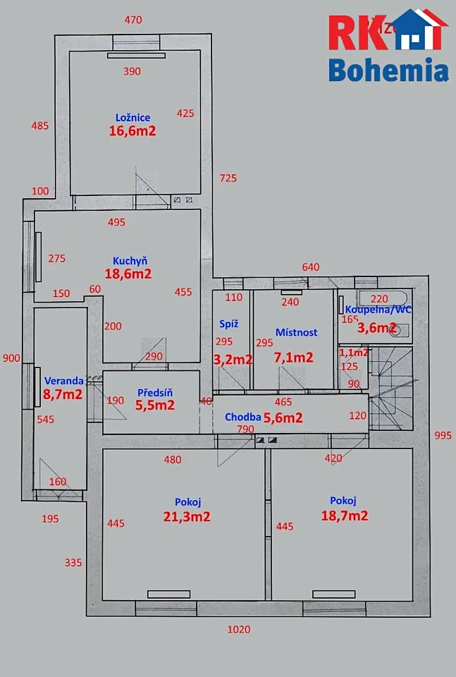 1. NP: bytová jednotka 3+1 /100 m2/ - veranda, chodba, kuchyně s průchodem do pokoje, další dva pokoje, menší koupelna s toaletou, technická místnost, spíž, vstup do půdního prostoru.