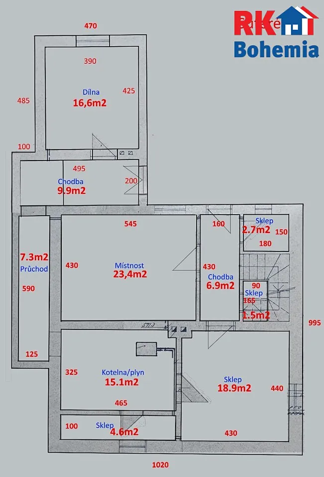 Dispozice: suterén /cca 70 m2/ - zde se nachází jeden velký pokoj, sklepní a úložné prostory, technická místnost s plynovým kotlem, dílna se vstupem ze dvora.