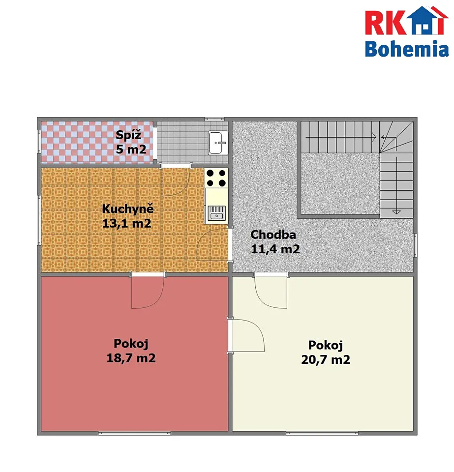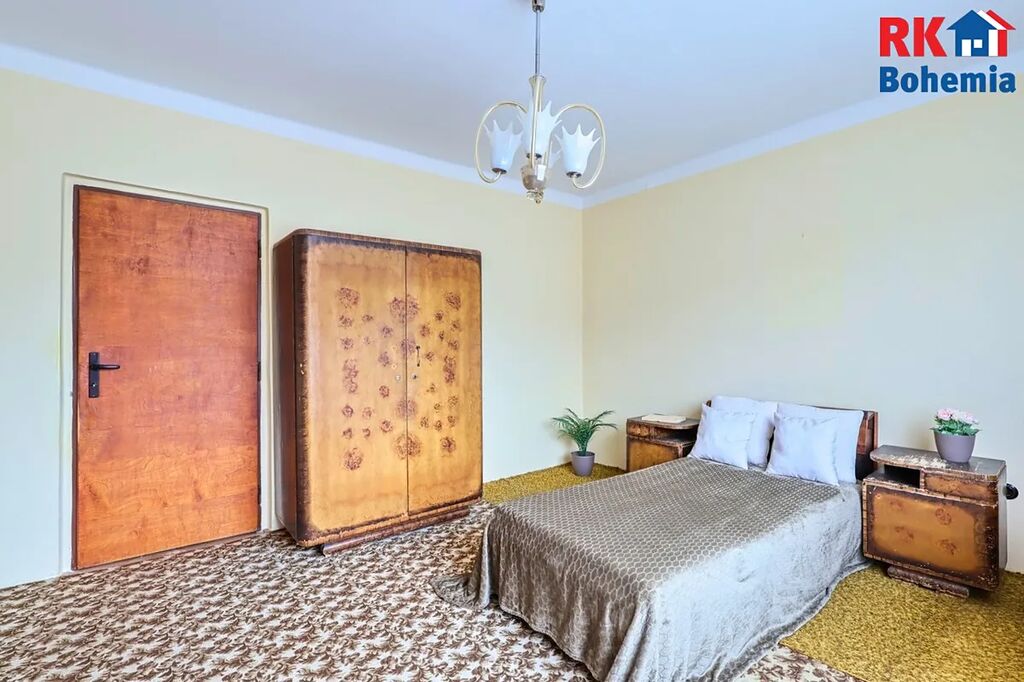 V 1.NP se nachází zádveří (cca 4,4 m2), hala (cca 9,5 m2), obývací pokoj (cca 17,9 m2), ložnice (cca 17,3 m2), koupelna s vanou, s WC a umyvadlem (cca 4 m2), kuchyň (cca 17,4 m2), spíž (cca 2,5 m2) a schodiště do sklepa a do 2.NP. Ve 2.NP se nachází 3 pokoje (cca 20,7 m2, cca 18,7 m2, cca 13,1 m2), spíž s umyvadlem (cca 5 m2) a chodba (cca 11,4 m2).