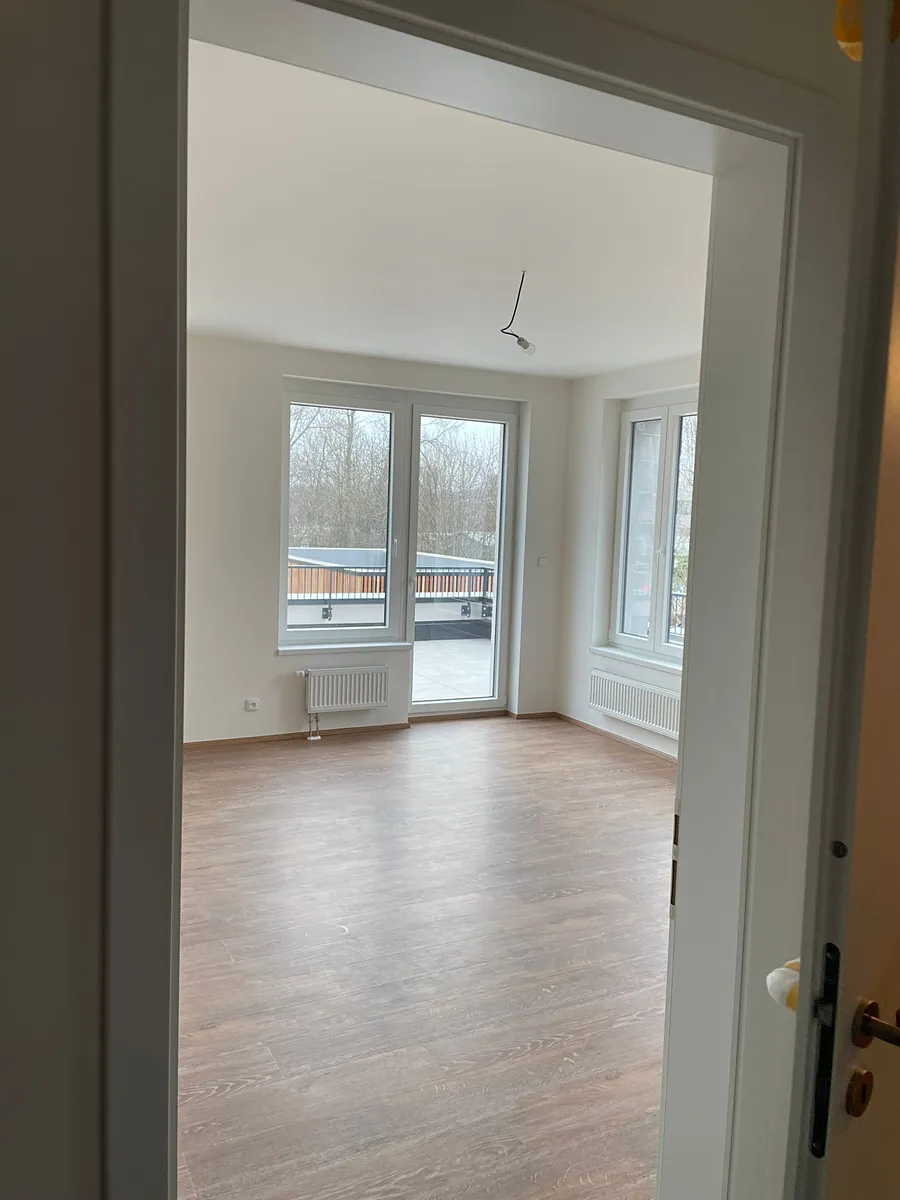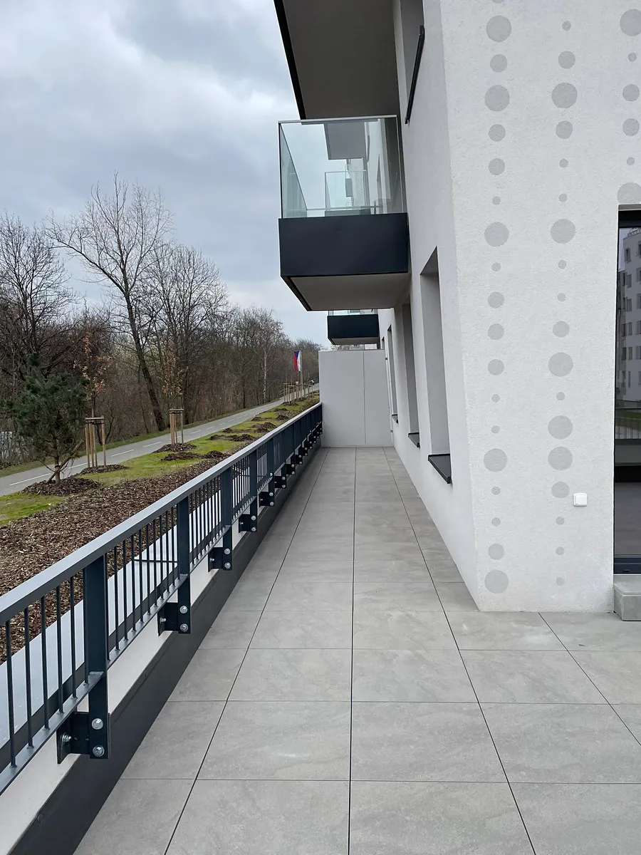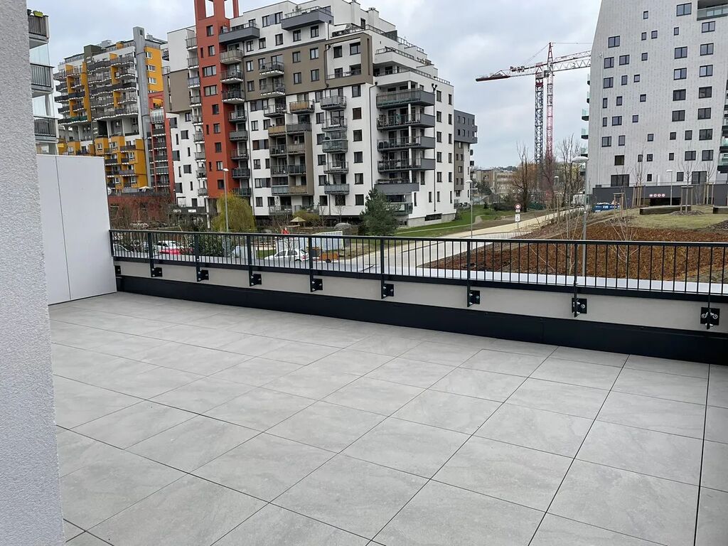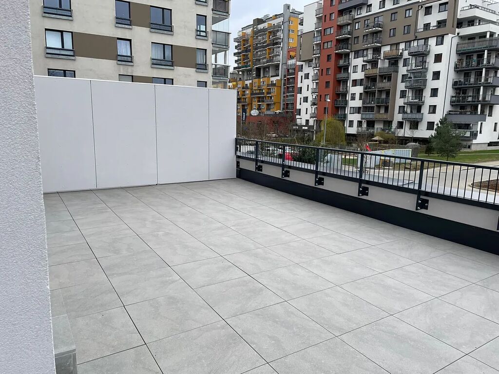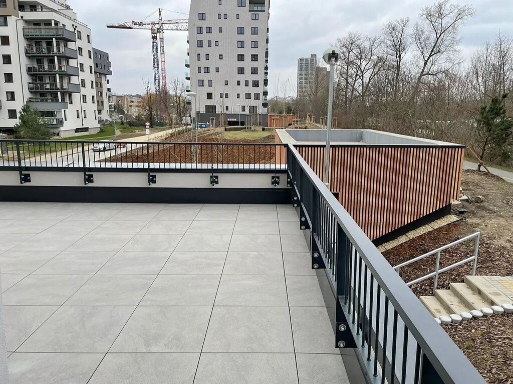 Zánovní byt s velkou terasou a garážovým stáním situovaný v 1.patře novostavby v žádané lokalitě pražské Harfy, u říčky Rokytky, s dobrou dostupností ke stanici metra B Vysočanská. Byt sestává z předsíně, koupelny s vanou a WC, komory, ložnice a obývacího pokoje s kuchyňským koutem a vstupem na rozlehlou terasu. Vybaven je novou kuchyňskou linkou s vestavěnou sklokeramickou varnou deskou, elektrickou troubou, lednicí s mrazákem a myčkou. K bytu přísluší garážové stání. Klidné prostředí, dobrá dostupnost ke stanici metra B Vysočanská nebo Českomoravská.