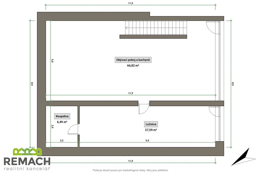 Celková rozloha pozemku se zahradou je 526 m², zastavěná plocha činí 128 m², podlahová 210 m² a užitná plocha 196 m².