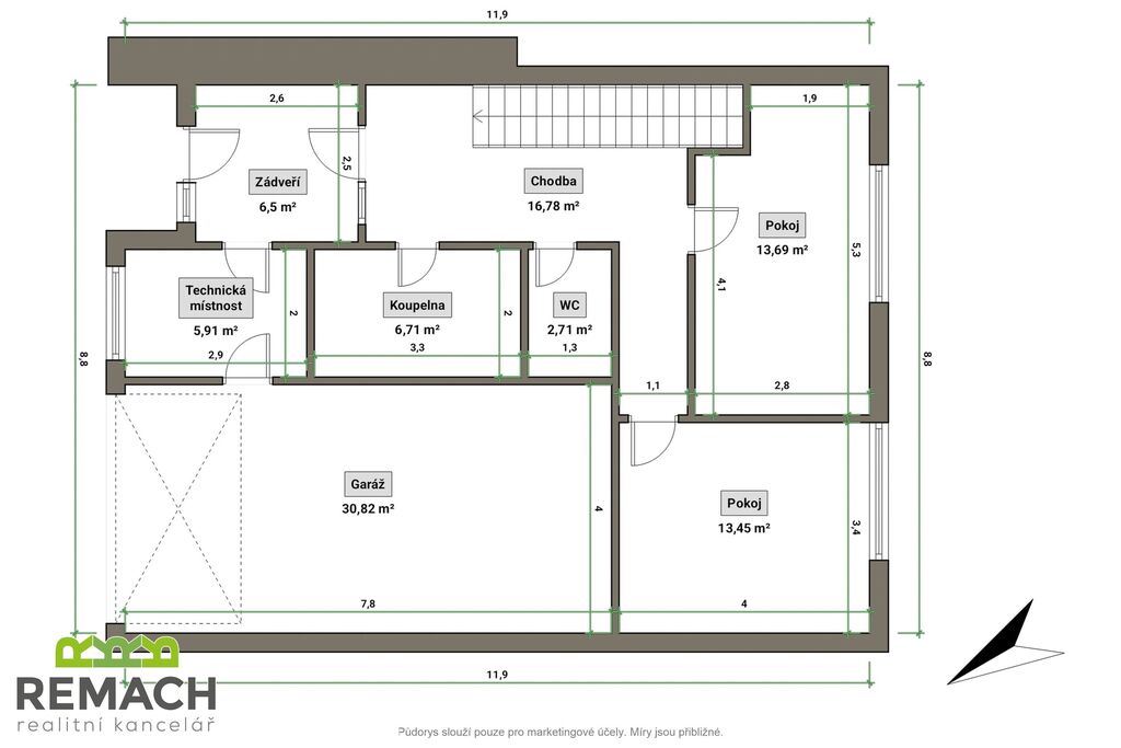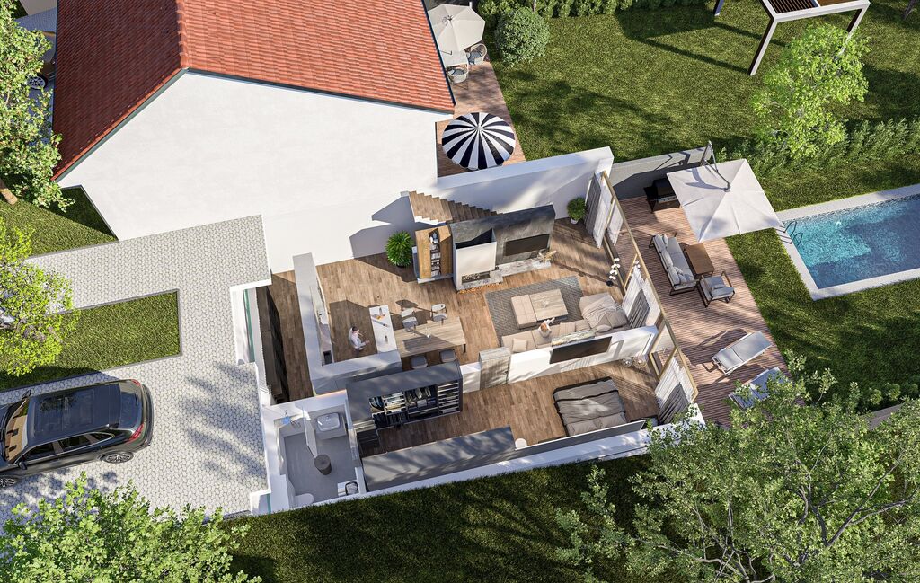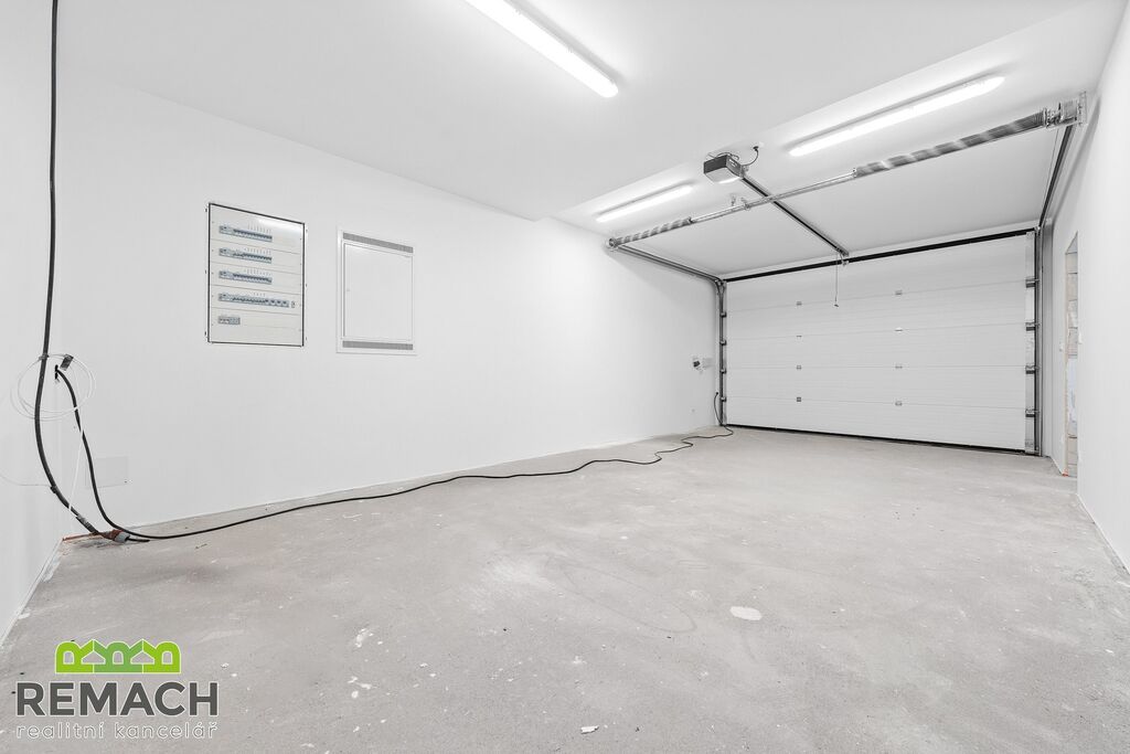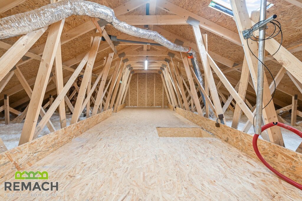 Terasa u domu je ideálním místem pro relaxaci nebo grilování s přáteli. Její finální podobu, a případně bazén, si zařídíte podle sebe. K dispozici je také garáž pro bezpečné parkování vašeho vozu a další parkovací místo na pozemku. Sezónní věci uskladníte na půdě s rozlohou 30 m².