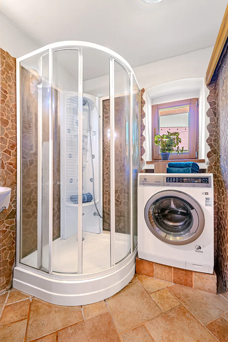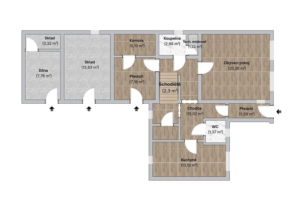 Přízemí nabízí prostorný obývací pokoj, kuchyni s jídelnou s přímým vstupem na zahradu, předsíň, koupelnu se sprchovým koutem, samostatné WC, technické zázemí, šatnu a dvě další místnosti, které jsou aktuálně využívány jako dílna a kuchyň. Z přízemí se také pohodlně dostanete po schodech do sklepa.