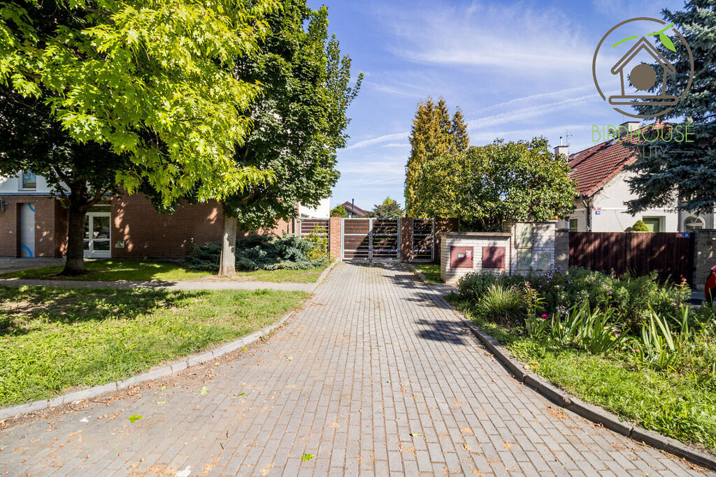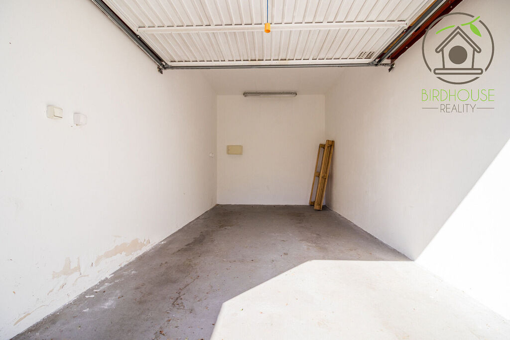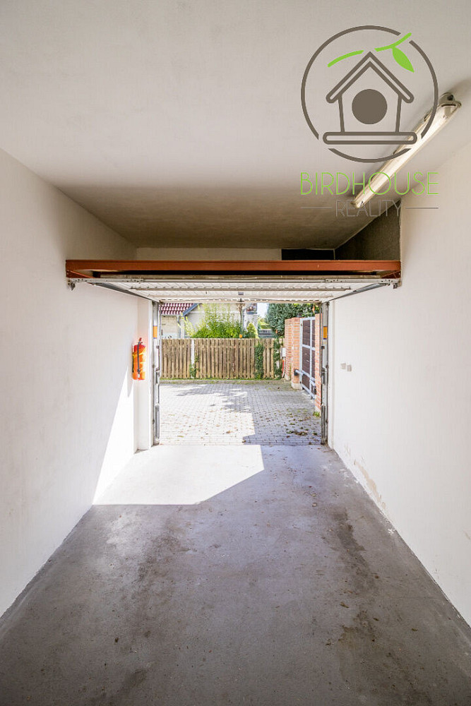 Součástí nabízeného bytu je garáž (14,17 m²) s úložným prostorem a elektřinou, což je v této lokalitě nezanedbatelná výhoda. Přesné rozměry garáže jsou Výška 2,73 m; Výška vjezdu 2,07 m; Šířka 2,69 m; Délka 5,27 m. Dále je součástí bytu také sklep (2,56 m²) a v suterénu domu je společná kočárkárna, kde lze uskladnit kolo či kočárek.