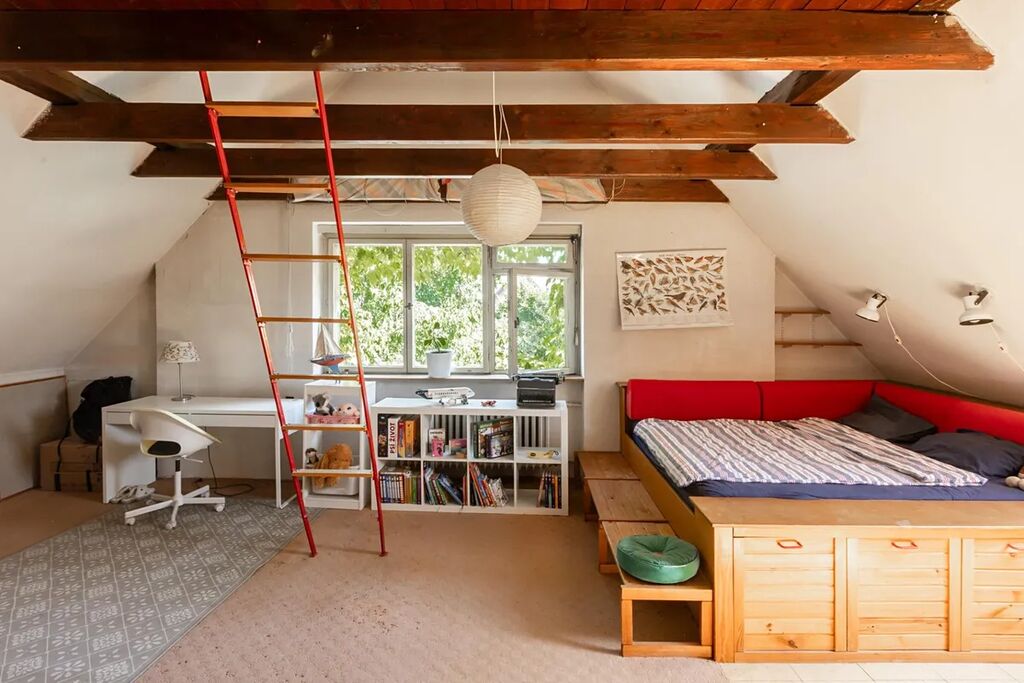 Do prvního patra vede krásné dřevěné schodiště. Najdeme zde jeden velký pokoj s postelí v patře pro účelné využítí prostoru. Na druhé straně se nachází rozlehlá půda, kde může vzniknout velký obytný prostor, který může být třeba rozdělen i na více pokojů.