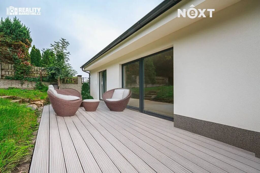 • Přízemí: prostorný obývací pokoj s kuchyňským koutem a vstupem francouzskými dveřmi na terasu a zahradu, technická místnost s kotlem a bojlerem (současně příprava na prádelnu a WC), chodba s propojením do garáže.