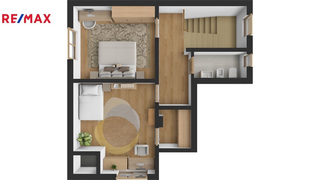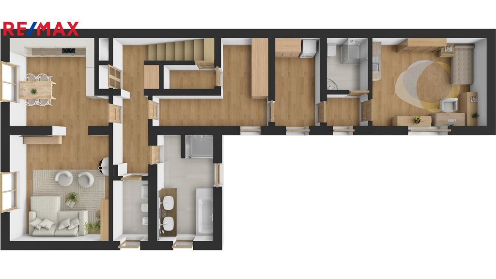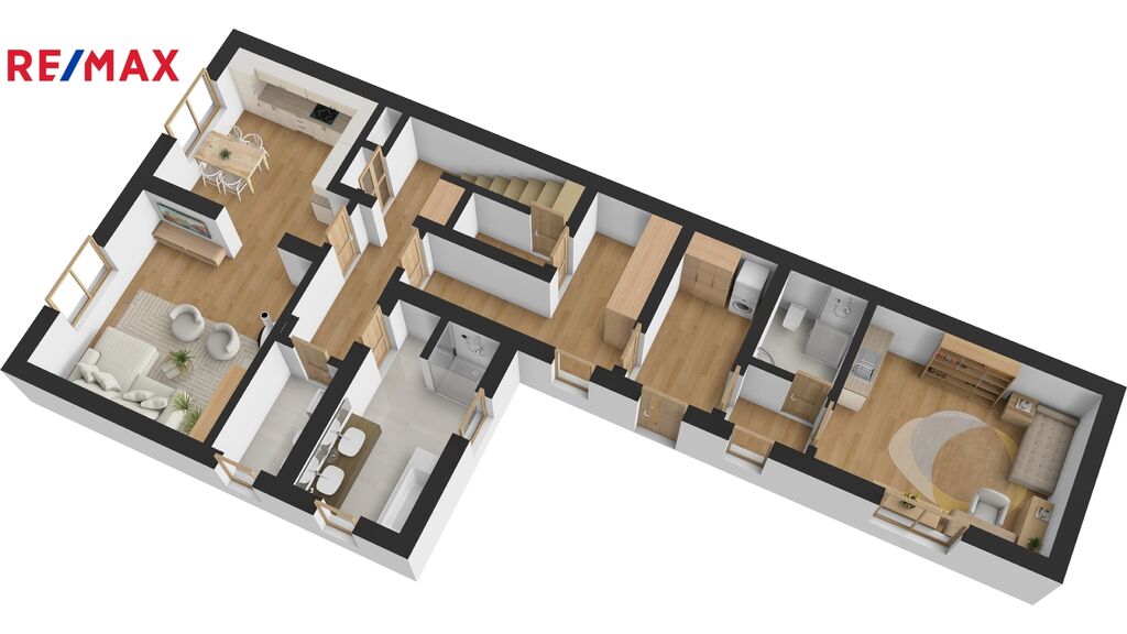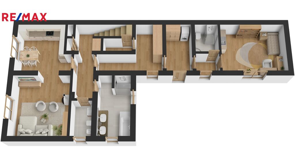 Přízemí: vstupní zádveří se šatní skříní INDECO, samostatná garsoniéra s vlastní koupelnou, WC a kuchyňskou linkou. Hlavní obytná část domu nabízí kuchyň s jídelnou, obývací pokoj, prostornou koupelnu s masážní vanou, sprchou, dvěma umyvadly a vestavěnou linkou s pračkou, samostatné WC s bidetem a technickou místnost s úpravnou vody a sklepem.