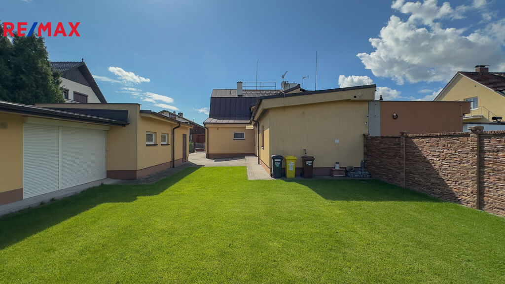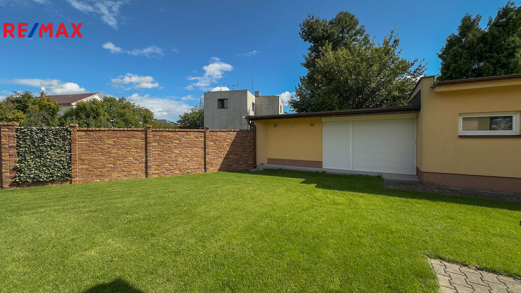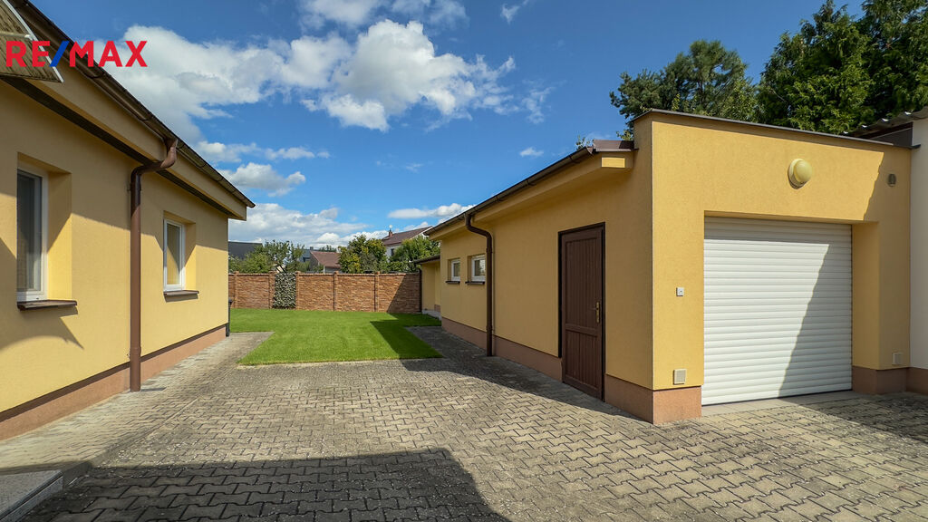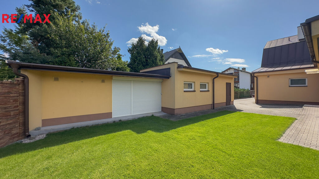 Na pozemku je prostorná garáž, na kterou navazuje pergola s elektrickým ovládáním. Pergola má na víc menší místnost, jako úložný prostor.