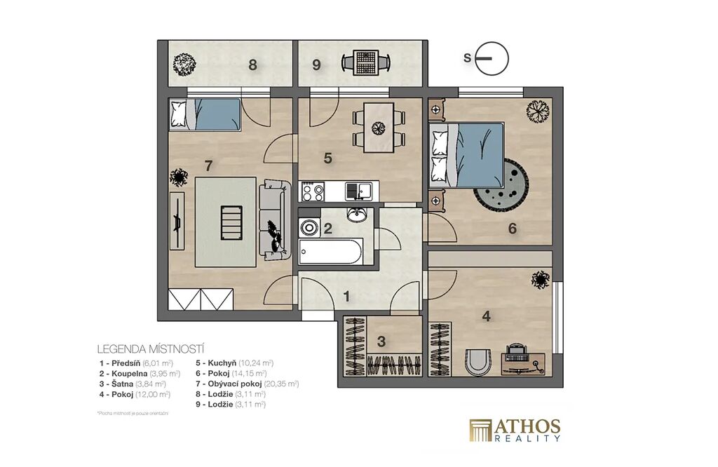 • Dispozice: 3+1 (14,1 m² / 12,0 m² / 20,3 m²)