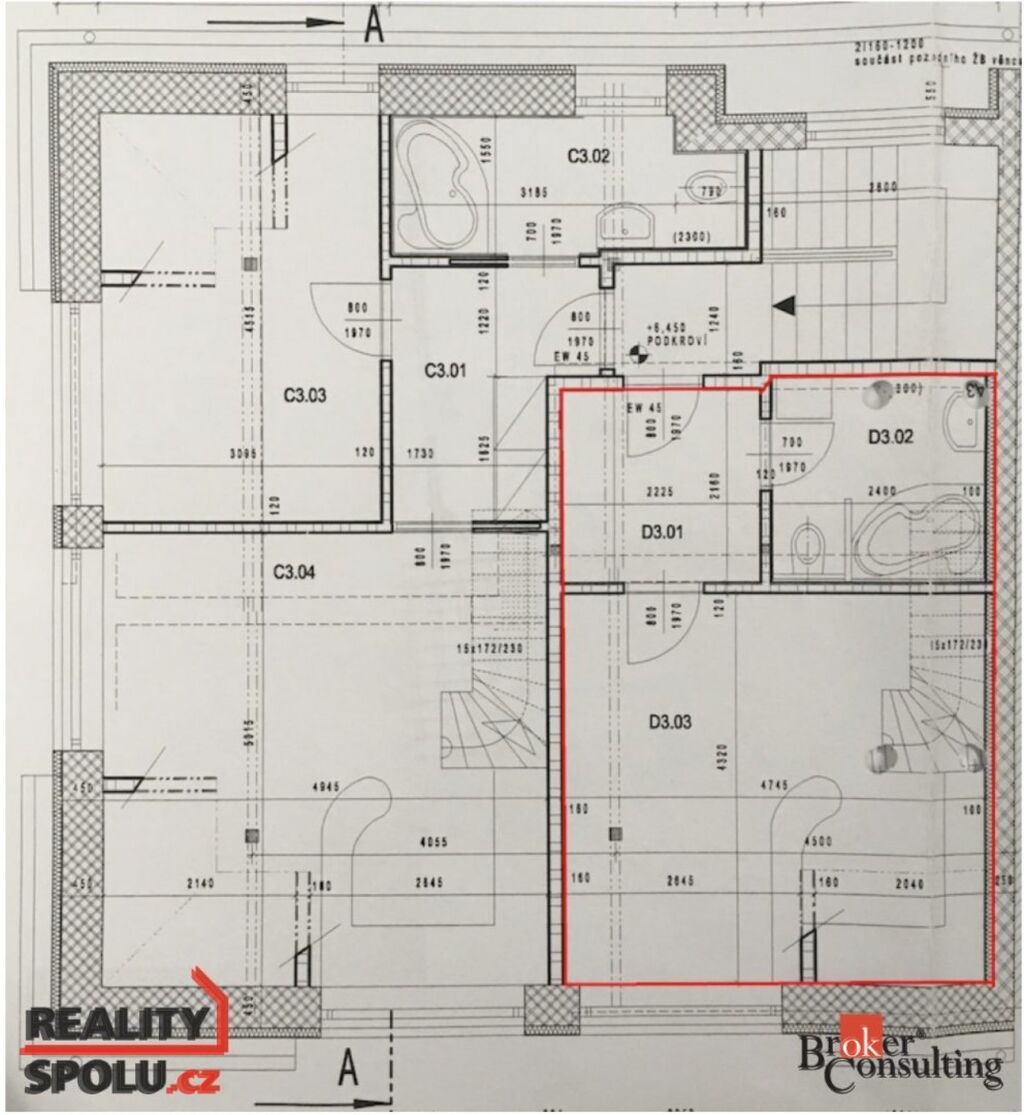 ve spodní části se nachází prostorný obývací pokoj s kuchyňským koutem a koupelna s rohovou vanou,