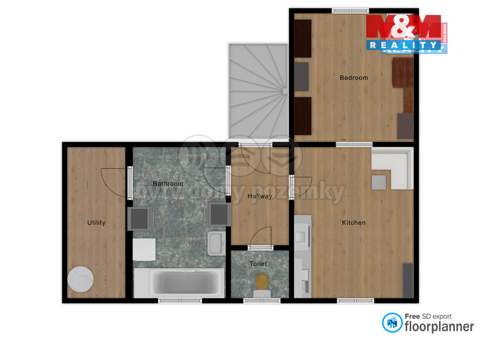 Byt se skládá ze samostatného pokoje, kuchyně s jídelním koutem, předsíně a koupelny s vanou a toaletou. Je plně vybaven – k dispozici je kuchyňská linka, lednička, sporák, pračka, postel, sedačka i úložné skříně. Byt je v dobrém stavu a připravený k nastěhování.