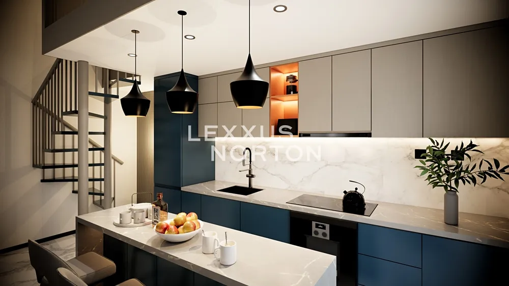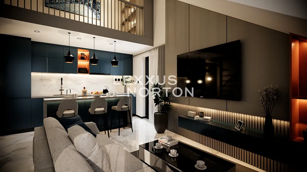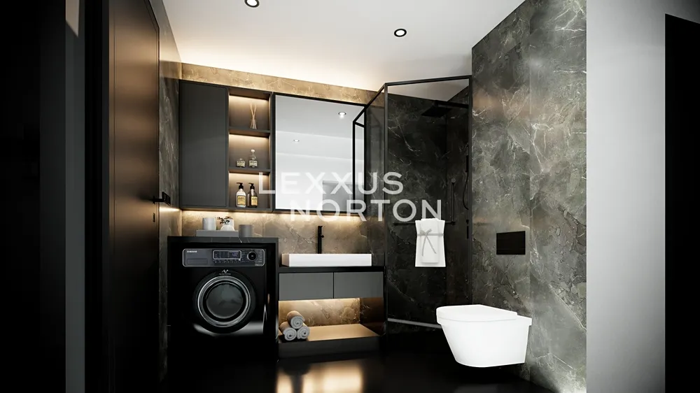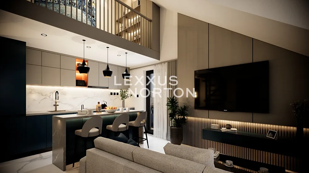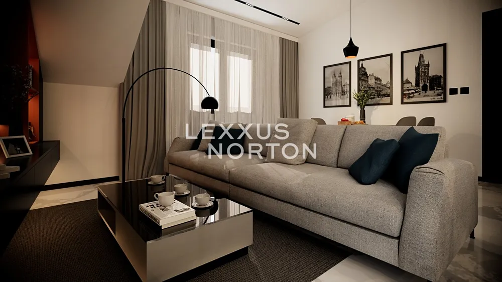 Centrálním prostorem je světlý obývací pokoj s kuchyňským koutem, ideální pro každodenní život i setkávání s přáteli. Koupelna se sprchovým koutem a toaletou je navržena v nadčasovém stylu s černými bateriemi Mexen Cube. Galerie bytu je rozdělena na pracovnou s šatnou, které nabízejí flexibilní využití a dostatek úložného prostoru.