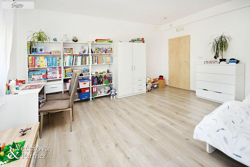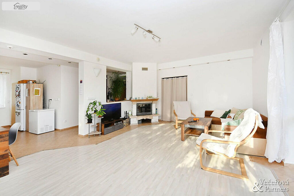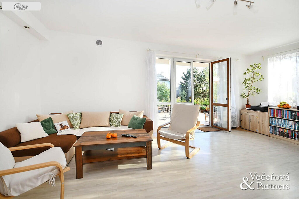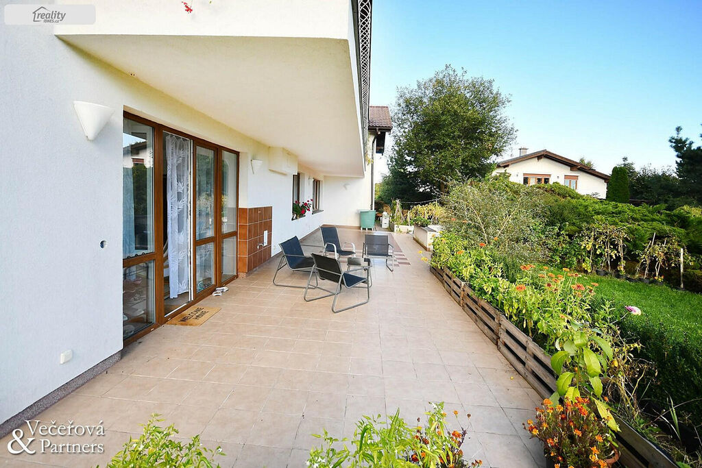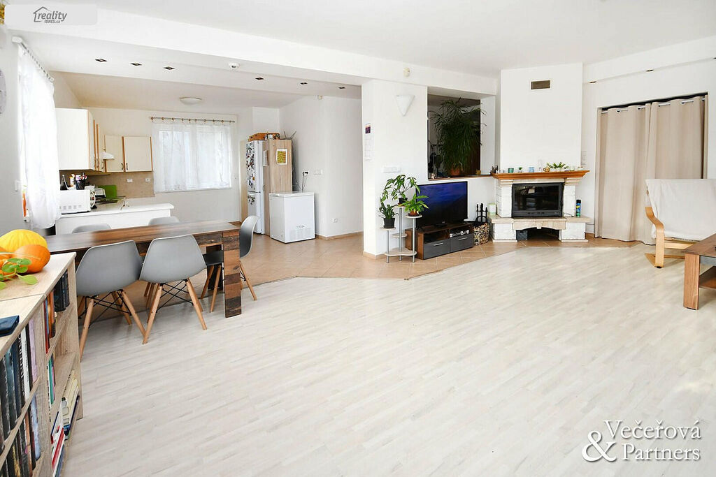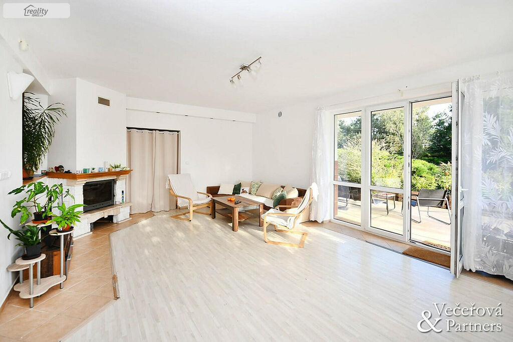 Byt se nabízí nezařízený, nábytek na fotografiích bude odstěhován. K dispozici jsou 3 ložnice, velká koupelna s vanou i sprchovým koutem a WC. Velkorysý obývací pokoj s kuchyňským koutem má 43 m² a navazuje na něj velká terasa s výhledem do zahrady. V celém bytě je podlahové vytápění. Navíc je v obývacím pokoji k dispozici krb, který má průduchy rozvedené do všech místností, takže můžete snížit své měsíční náklady a topit krbem.