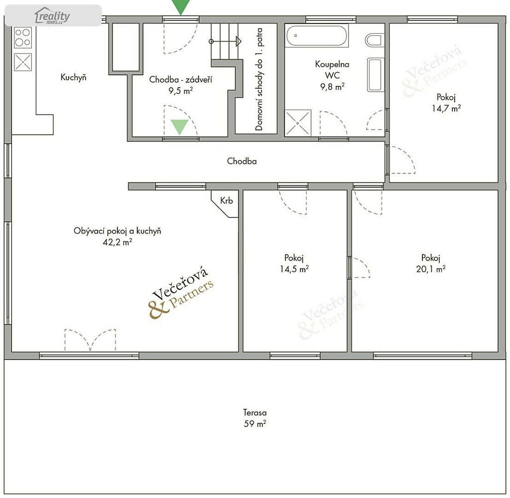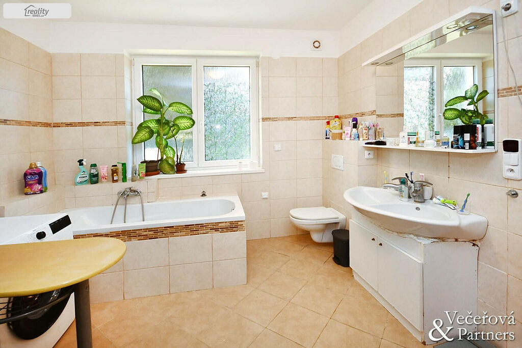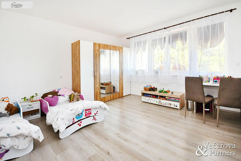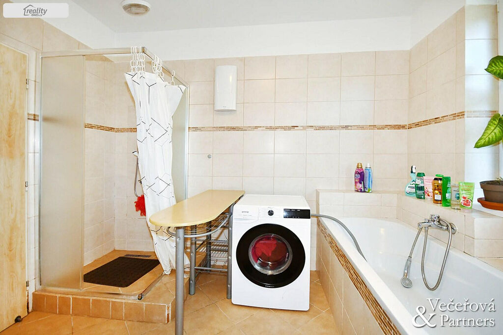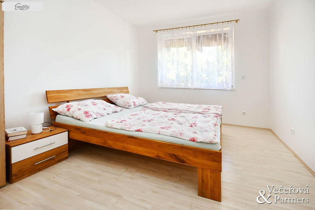 Byt se nabízí nezařízený, nábytek na fotografiích bude odstěhován. K dispozici jsou 3 ložnice, velká koupelna s vanou i sprchovým koutem a WC. Velkorysý obývací pokoj s kuchyňským koutem má 43 m² a navazuje na něj velká terasa s výhledem do zahrady. V celém bytě je podlahové vytápění. Navíc je v obývacím pokoji k dispozici krb, který má průduchy rozvedené do všech místností, takže můžete snížit své měsíční náklady a topit krbem.