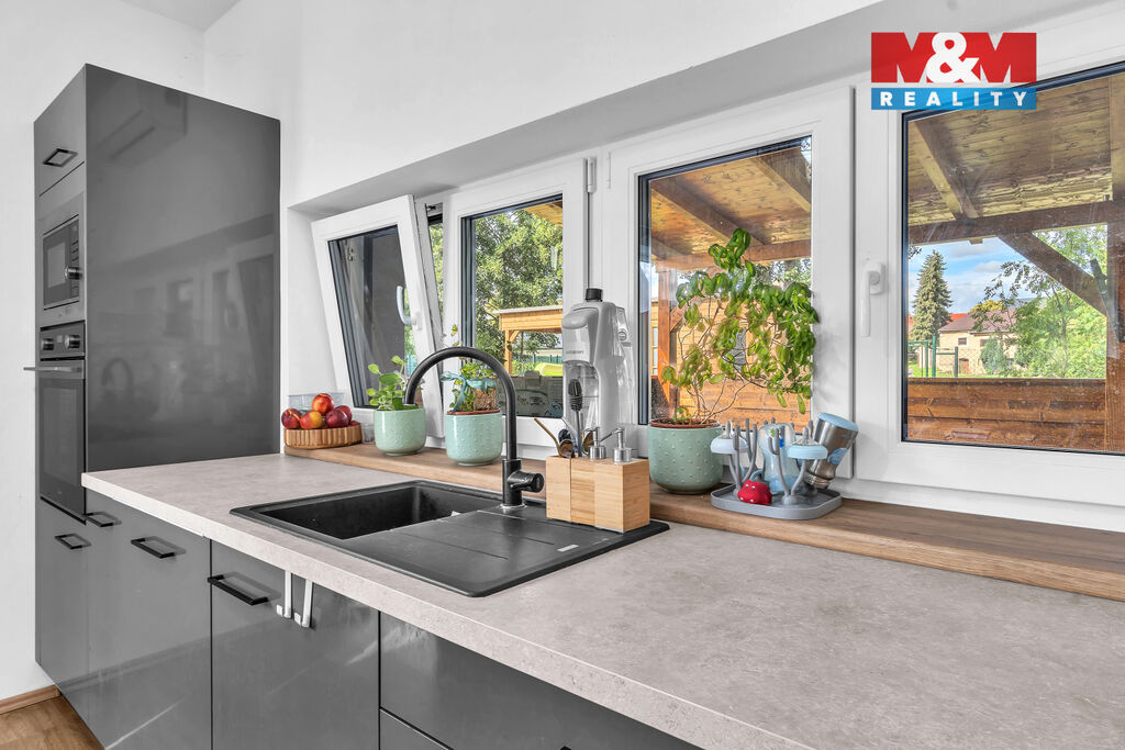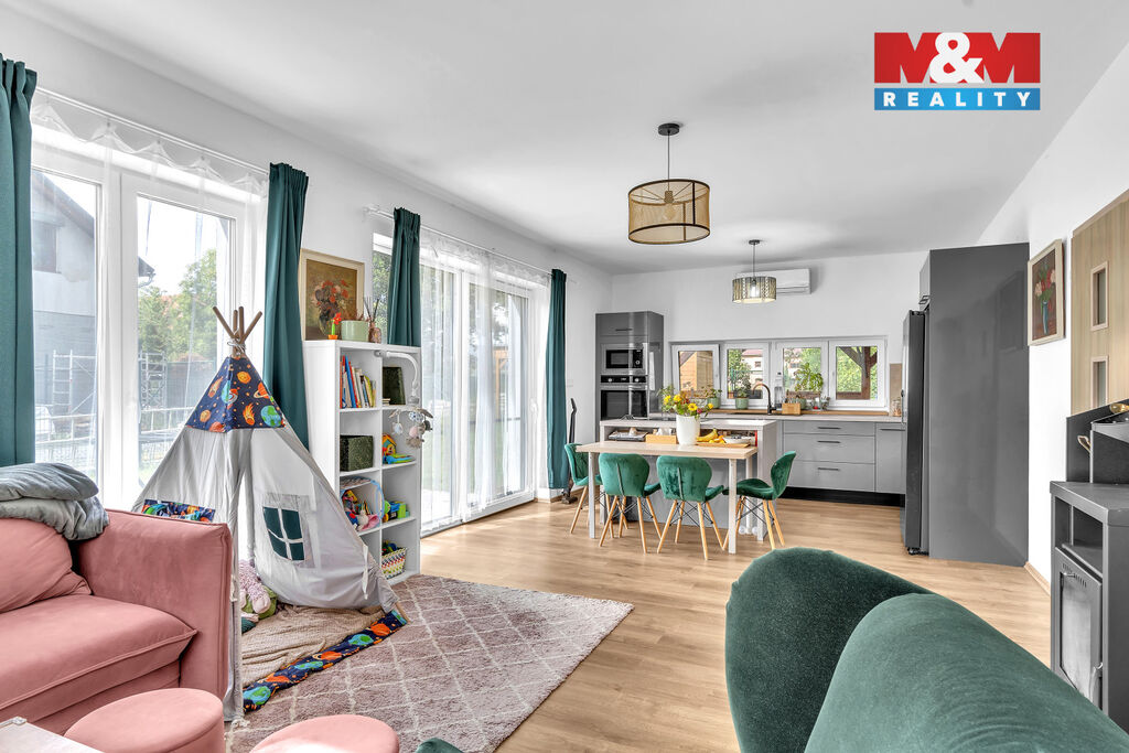 Nabízíme k prodeji moderní rodinný dům v klidné části obce Vykáň. Jedná se o rohovou část řadového dvoupodlažního domu, kolaudovaného v roce 2023. Dispozice 4+kk zahrnuje prostorný obývací pokoj s kuchyňským koutem, krbovými kamny a přímým vstupem na krytou terasu 28 m². V přízemí dále najdete chodbu, komoru, samostatné WC a technickou místnost. V patře se nachází tři ložnice, šatna a koupelna s bidetem, vanou, dvěma umyvadly a sprchovým koutem. Nad celým domem je pochozí půdní prostor, který slouží jako praktické úložné místo. Součástí pozemku 452 m² je nekrytá terasa 10 m², zahradní domek 9 m² s přístřeškem 9 m², dřevník u terasy a sklad 6 m² s vchodem vedle hlavního vstupu. Celý pozemek je oplocen a nabízí dostatek soukromí. Neváhejte a přijďte si prohlédnout tuto novostavbu, která čeká na svého nového majitele! Na návsi najdete úřad, obchod, autobusové spojení, a v budoucnu zde vznikne i školka. Autem je veškerá občanská vybavenost dostupná do 5 minut.
