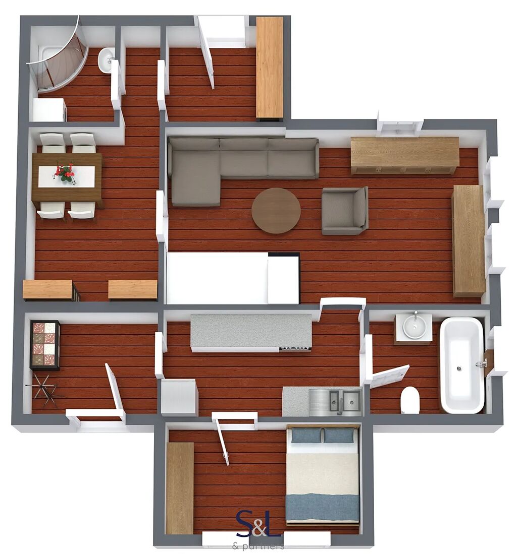 - Na jedné straně navazuje kuchyně, za níž je prakticky umístěna ložnice a koupelna.