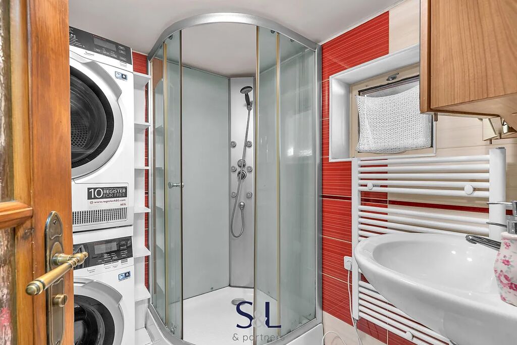 - Na opačné straně, oddělené přes obývací prostor, je jídelní kout a další koupelna se sprchovým koutem.