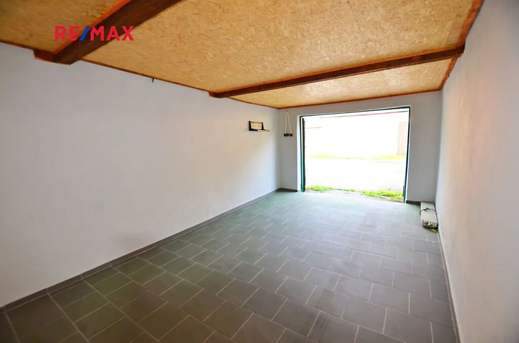 Garáž je po rekonstrukci: oprava střešní krytiny, zpevnění trámové konstrukce a vnitřního podhledu, keramická dlažba, výmalba a nátěr vrat. Dvoukřídlá dřevěná vrata (šířka 2,24m x výška 1,92m), střecha trámové konstrukce s mírným spádem (výška vnitř.podhledu mezi 2,13-2,40m). Velkou výhodou je funkční připojení na elektřinu 240V.