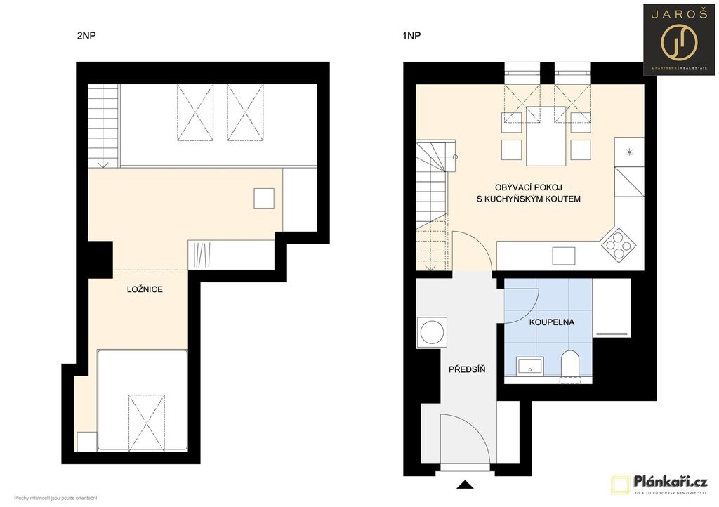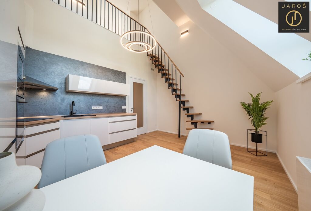 Byt je částečně zařízen a připraven k okamžitému nastěhování. Součástí je moderní kuchyňská linka značky Oresi, dřez Franke, baterie Hansgrohe, designová svítidla, dubové podlahy i dubové schodiště. Koupelna je stylová a vybavená sprchovým koutem. Ve vrchním patře se nachází prostor ideální pro ložnici a pracovnu.