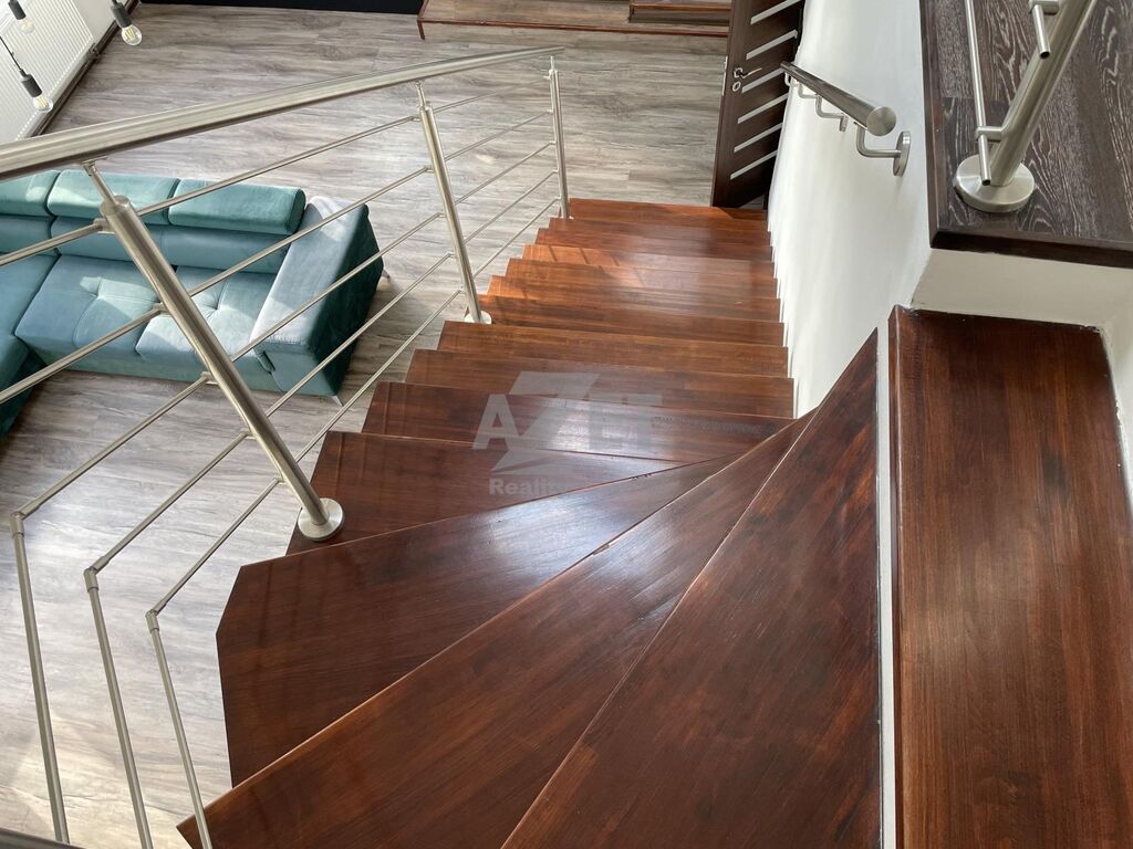 Vstupní chodba disponuje vestavěnou skříní na míru, která poskytuje velkorysý úložný prostor. Hlavní obytná místnost je světlá a vzdušná, s originálním schodištěm vedoucím do podkroví, kde se nacházejí samostatné pokoje vhodné jako ložnice a dětský pokoj. Díky této dispozici je byt velmi variabilní a umožňuje vytvořit si skutečně osobité bydlení podle vlastních potřeb.