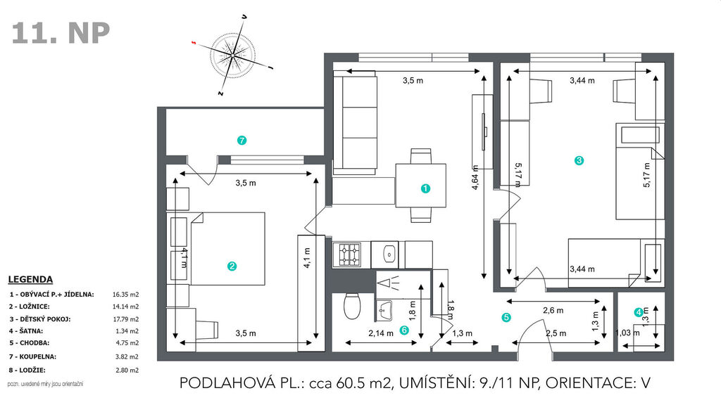 Byt je po částečné rekonstrukci ve velmi dobře udržovaném stavu. V centru dění se nachází obývací pokoj společný s novou kuchyňskou linkou a jídelnou (cca 16.35 m²). Po stranách obývacího pokoje je dětský pokoj (cca 17.79 m²) a ložnice (14.14 m²) s lodžií. V původním jádře je koupelna se sprchovým koutem společná s WC.
