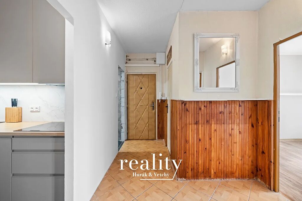 Za ním je vstup do kuchyně s jídelním koutem (12,3m2), která byla zrekonstruována a je vybavena linkou na míru.