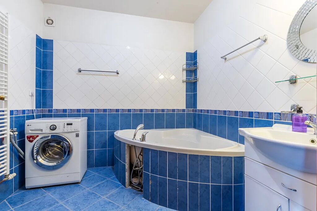 Jednotka se skládá ze čtyř oddělených místností : kuchyně s obývacím pokojem, dvou ložnic a pracovny. Dále k bytu náleží koupelna se sprchovým koutem + WC, koupelna s vanou + WC a předsíň. V obývacím pokoji nalezneme i krbová kamna. V ložnicích a pracovně tvoří podlahové povrchy laminát, v koupelnách a předsíni keramická dlažba.