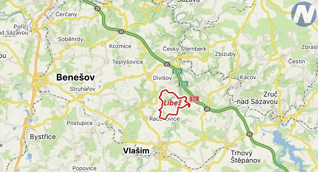 Libež leží jen 5 minut od Vlašimi, necelých 20 minut od Benešova a pohodlně se napojíte na dálnici D1 – exit 41 Šternov, odkud jste v Praze do 40 minut.