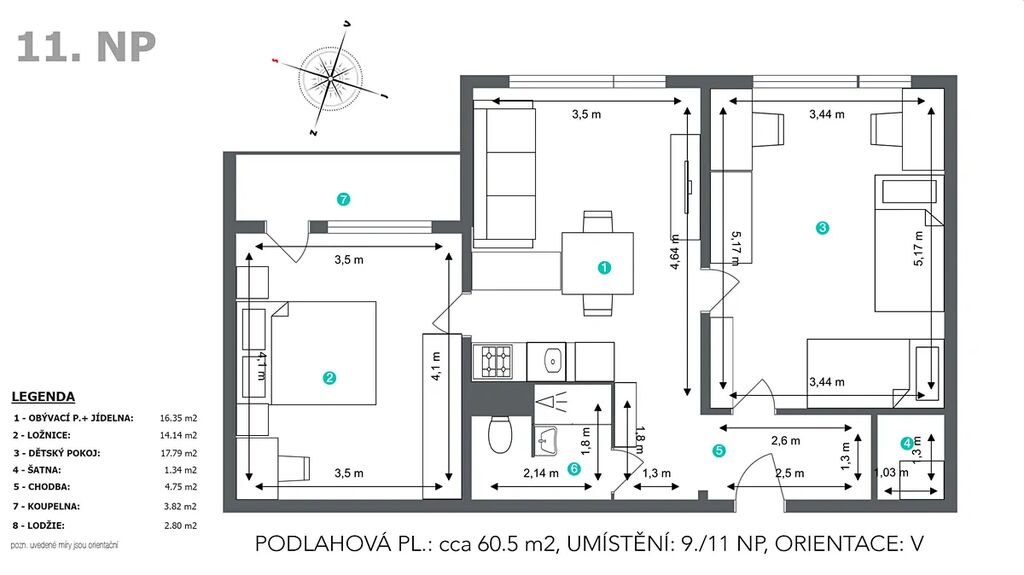 Byt je po částečné rekonstrukci ve velmi dobře udržovaném stavu. V centru dění se nachází obývací pokoj společný s novou kuchyňskou linkou a jídelnou (cca 16.35 m2). Po stranách obývacího pokoje je dětský pokoj (cca 17.79 m2) a ložnice (14.14 m2) s lodžií. V původním jádře je koupelna se sprchovým koutem společná s WC.