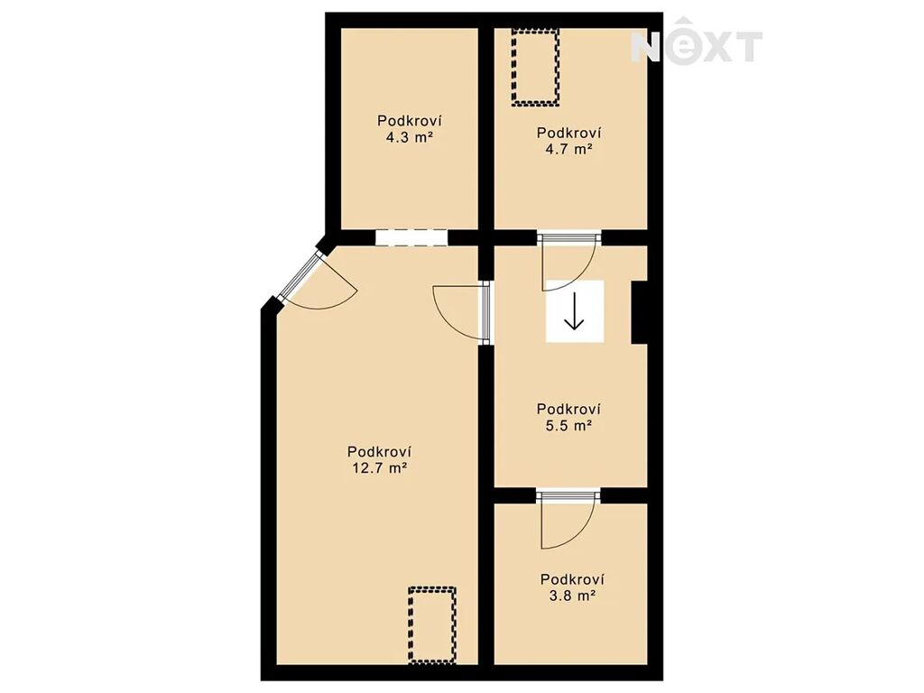 Dispozice: Přízemí – pokoj, kuchyň, koupelna; Podkroví – pokoj, WC