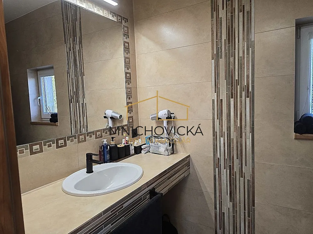 Nemovitost kromě bydlení nabízí také wellness: saunu, venkovní vířivku, venkovní vytápěný bazén 3x5 metrů s protiproudem a posuvným krytím. Vše je dobře promyšlené, aby to majitelům skutečně sloužilo, ne jen pěkně vypadalo.