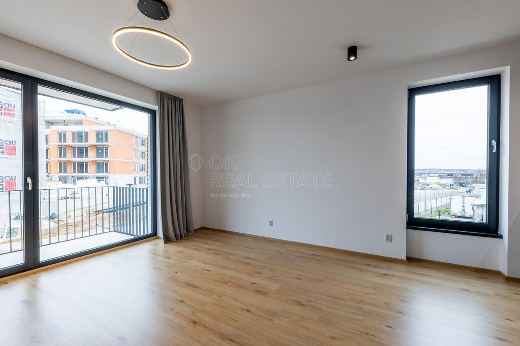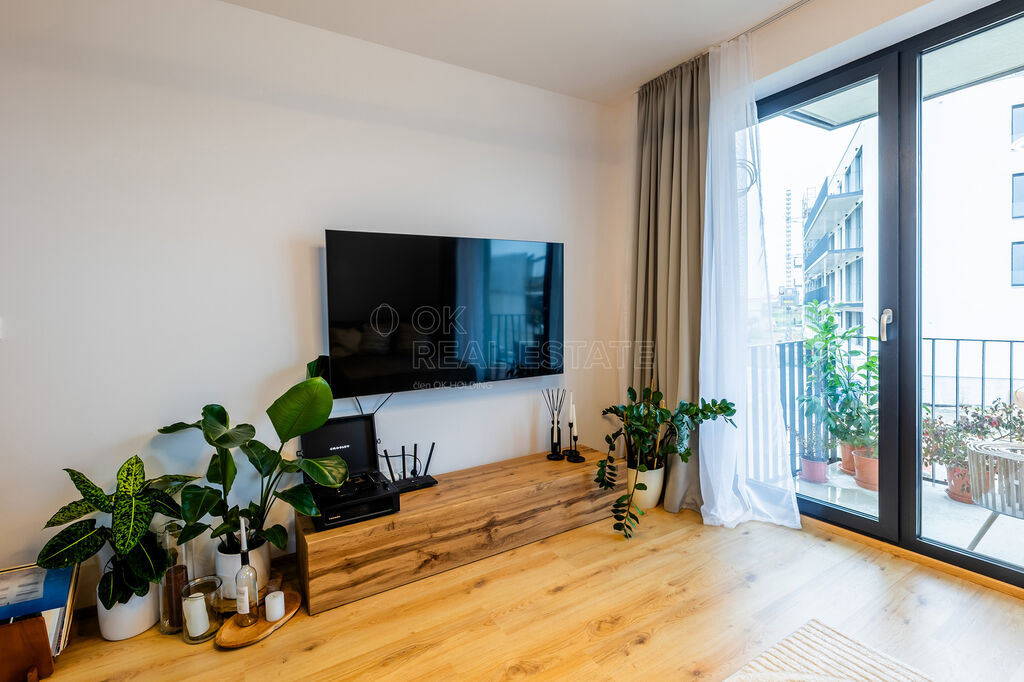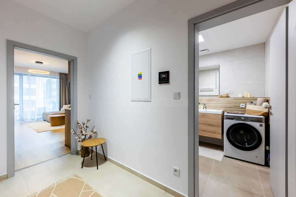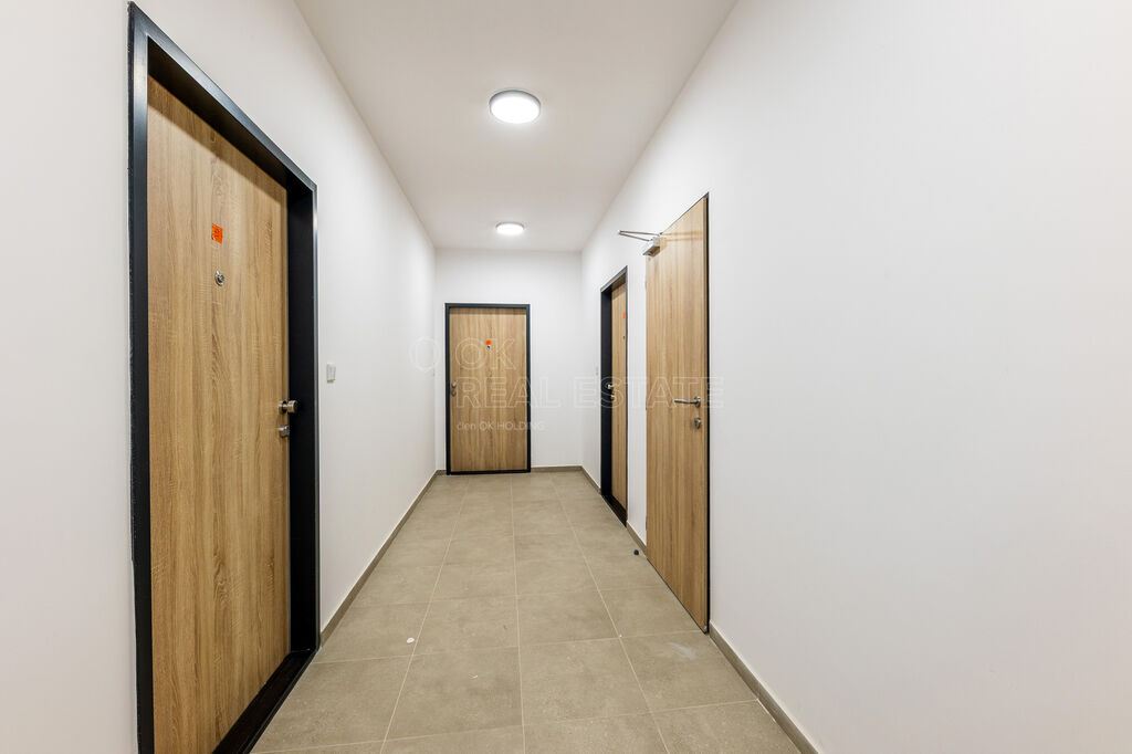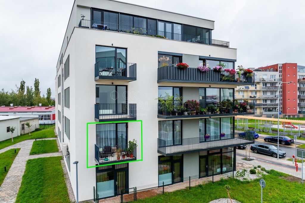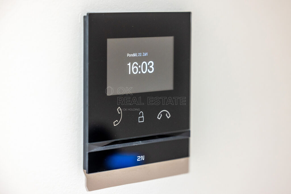 V bytě se nachází obývací pokoj (23 m2) s moderně zařízenou kuchyňskou linkou s veškerými spotřebiči včetně lednice a robotického vysavače, kvalitně provedená koupelna včetně velkoformátové dlažby s WC, sprchovým koutem a pračkou se sušičkou (5,4 m2) a předsíň (cca 6 m2), ve které je na míru vestavěná prostorná skříň. K bytu dále náleží balkón o ploše zhruba 4 m2 s výhledem do klidného okolí, sklepní kóje hned vedle bytu a venkovní parkovací stání za příplatek 1.000 Kč. Velkou výhodou bytu je podlahové vytápění a smart systém na regulaci teploty skrze mobilní aplikaci.